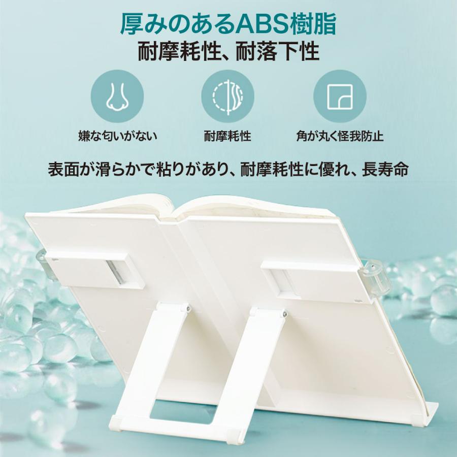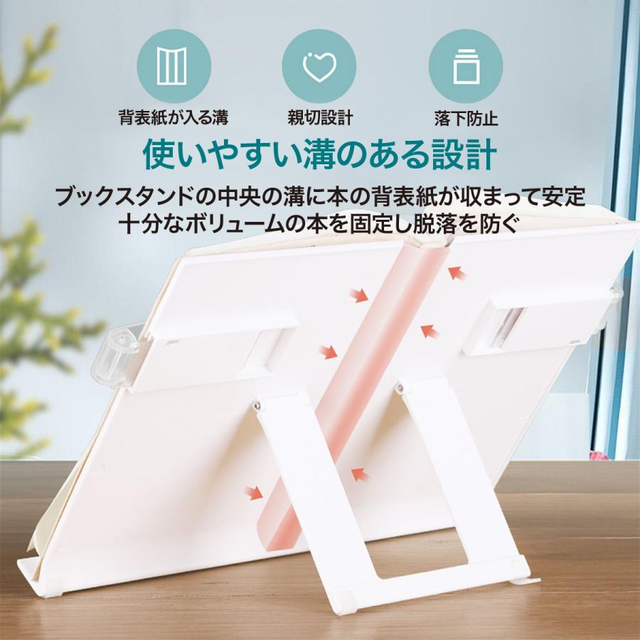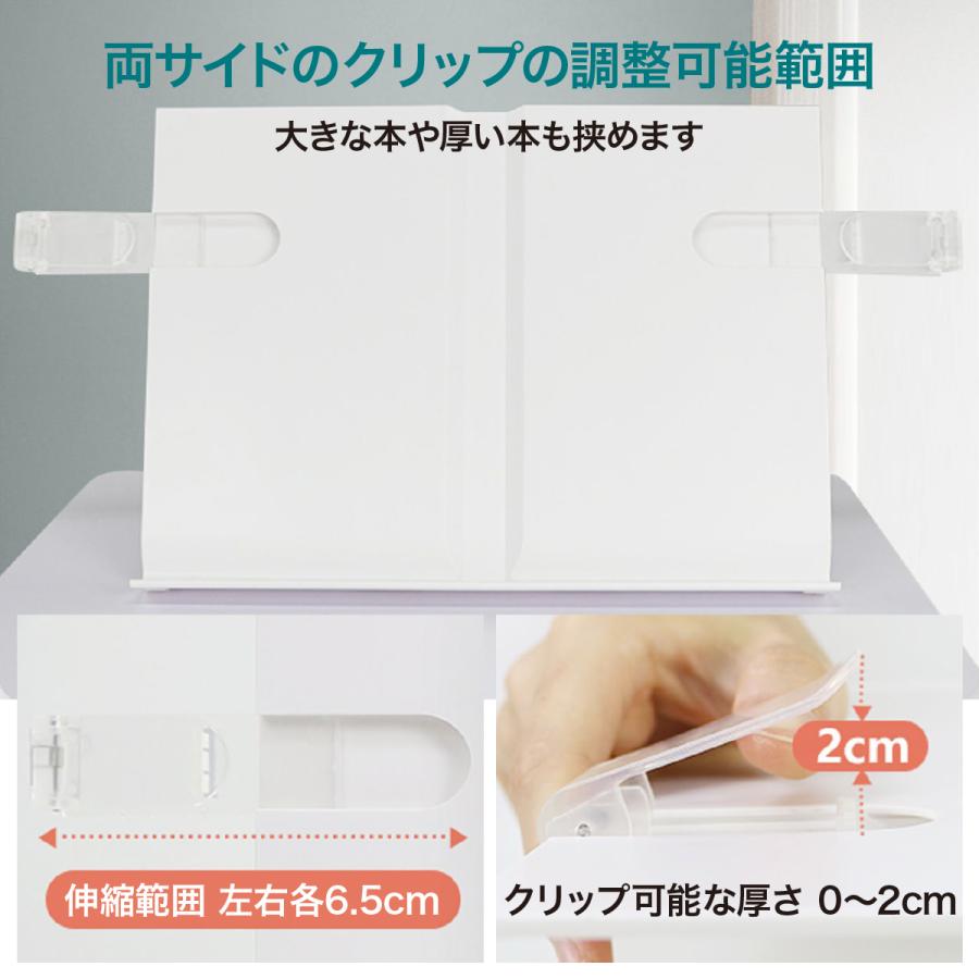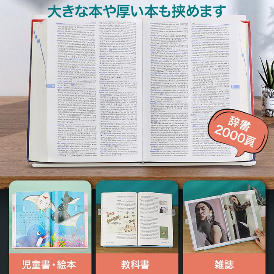 多機能ブックスタンド子供たちが読書習慣を身につけるために役立つ設計。ブックスタンド中央の溝に本の背表紙が収まって安定。十分なボリューム本を固定し脱落を防ぐ。両サイドについてるクリップは調整できるので、大きい本や厚い本にも対応。クリップが透明なので、文字や絵を隠さなく使いやすい。