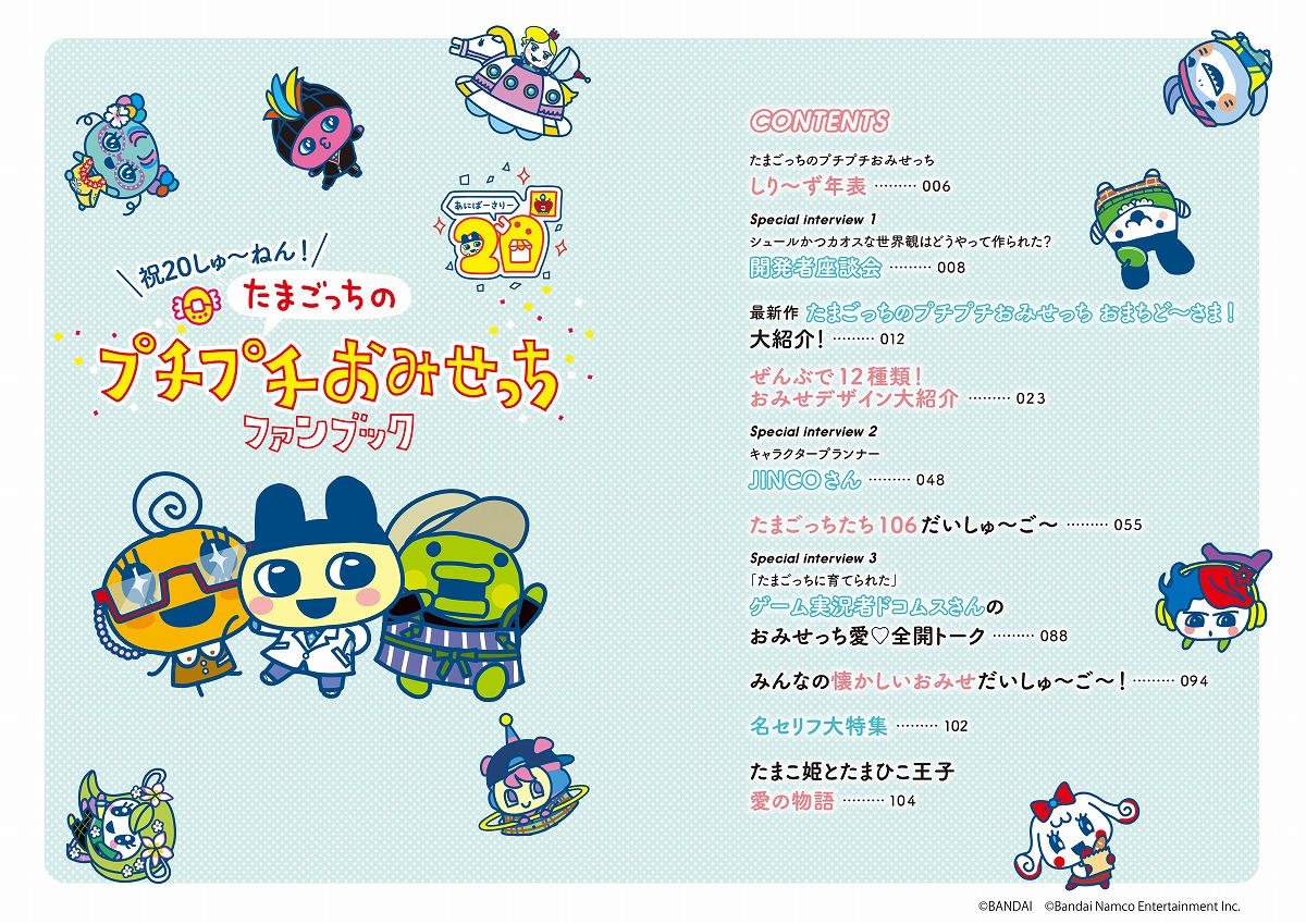 たまごっちのプチプチおみせっち しり〜ず年表/Special interview1 シュールかつカオスな世界観はどうやって作られた?開発者座談会/最新作 たまごっちのプチプチおみせっち おまちど〜さま!大紹介!/ぜんぶで12種類!おみせデザイン大紹介/Special interview2 キャラクタープランナー JINCOさん/たまごっちたち106だいしゅ〜ご〜/Special interview3 「たまごっちに育てられた」ゲーム実況者ドコムスさんのおみせっち愛 全開トーク/みんなの懐かしいおみせだいしゅ〜ご〜!/名セリフ大特集/たまこ姫とたまひこ王子 愛の物語