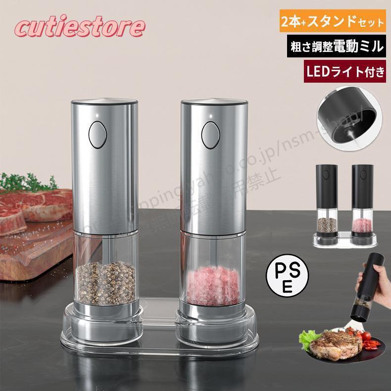 電動ミル 2本セット ペッパーミル 電動 スパイスミル 台座付き 電動 ペッパーミル 岩塩 ソルト ミル 充電式 LEDライト 粗さ調節可能 95ml容器