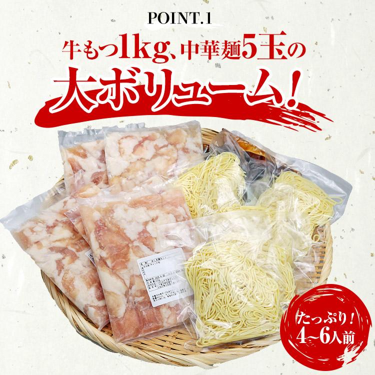 牛もつ1kg(200g×5)、中華麺5玉、濃縮スープ2袋入。