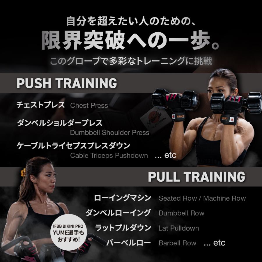 ALLOUTトレーニンググローブで最後の追い込みが可能になる!プル系(引くトレ)プッシュ系(押すトレ)のパフォーマンスアップに!
