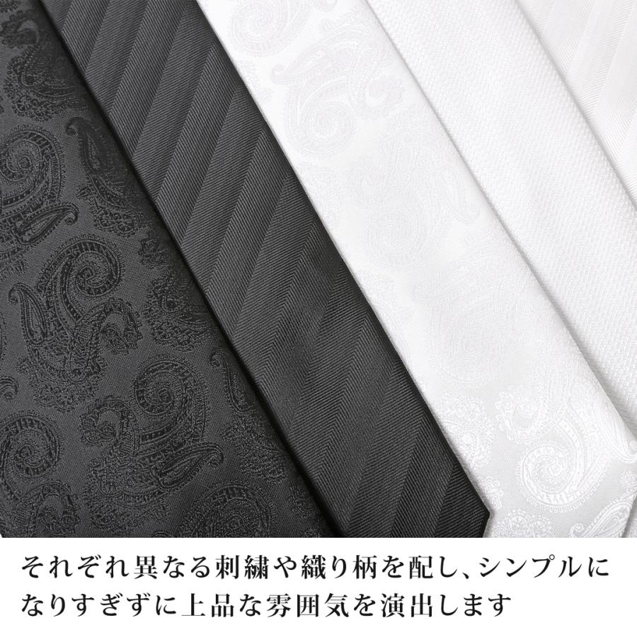 フォーマル用のワンタッチネクタイで、それぞれ異なる刺繍や織り柄を配し、シンプルになりすぎずに上品な雰囲気を演出してくれます。