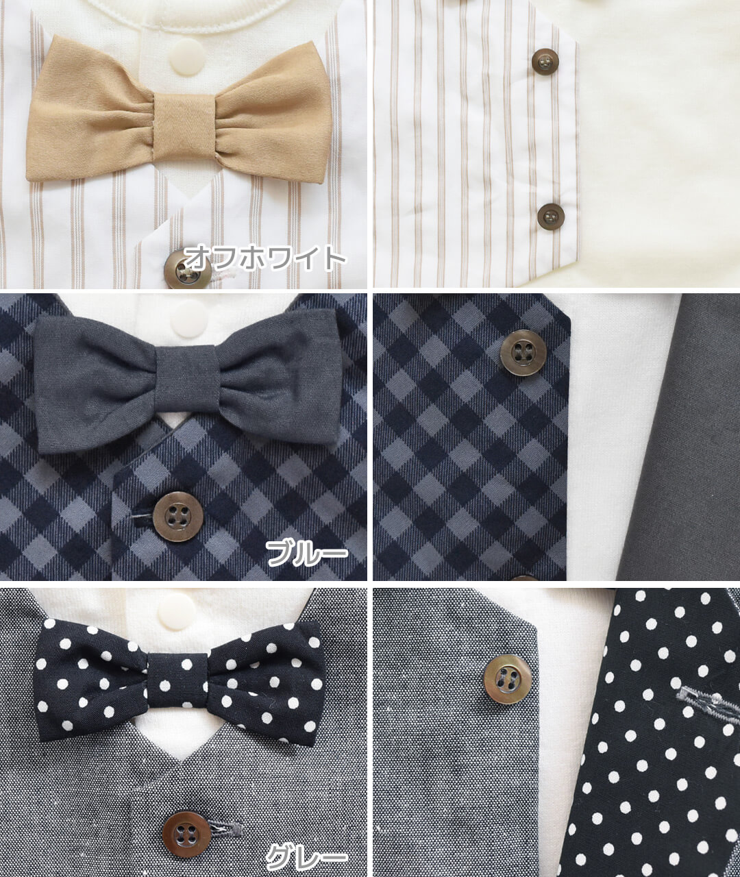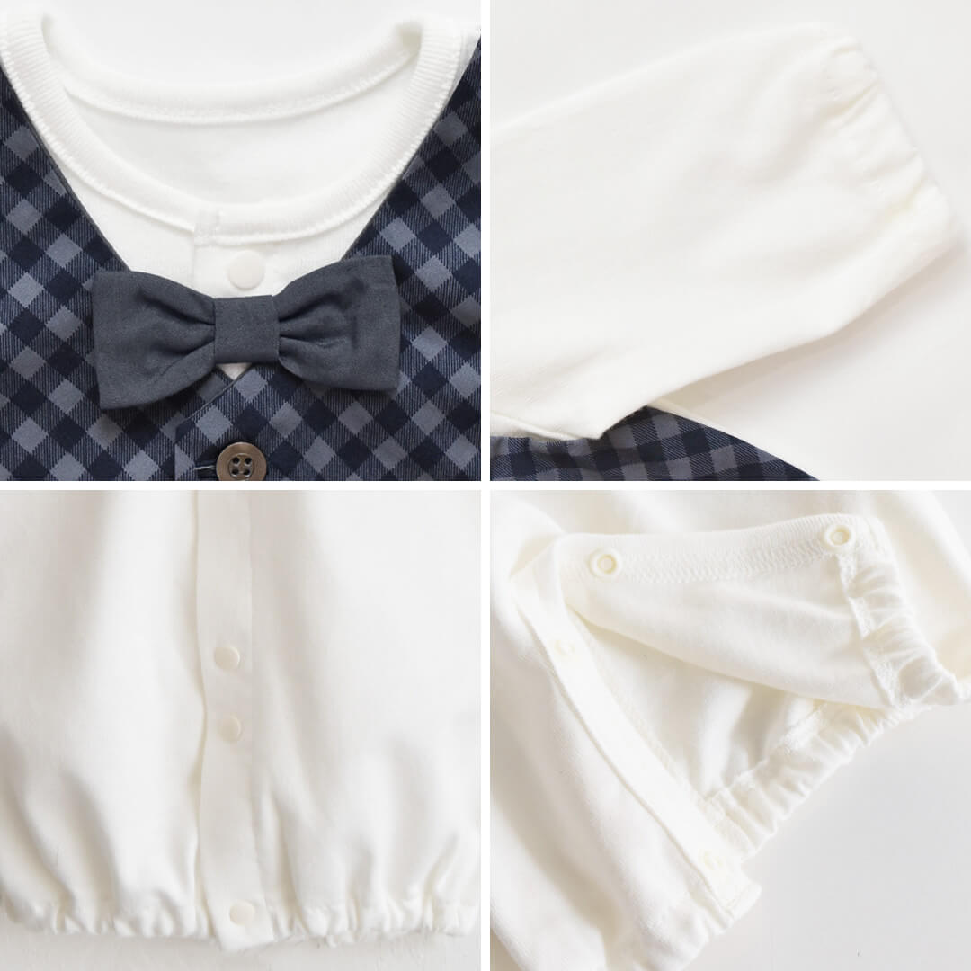 オケージョンにぴったりの3点セット。新生児からご使用いただけます。可愛いベスト風のデザインと蝶リボンがおめかし感アップでオケージョンにもぴったり。生まれてすぐはドレスタイプ、裾部分のスナップボタンを留め変えてカバーオールとしてもご使用いただけるので、お子様の成長にあわせて長くご愛用いただけます。