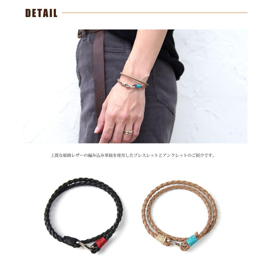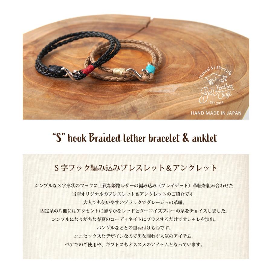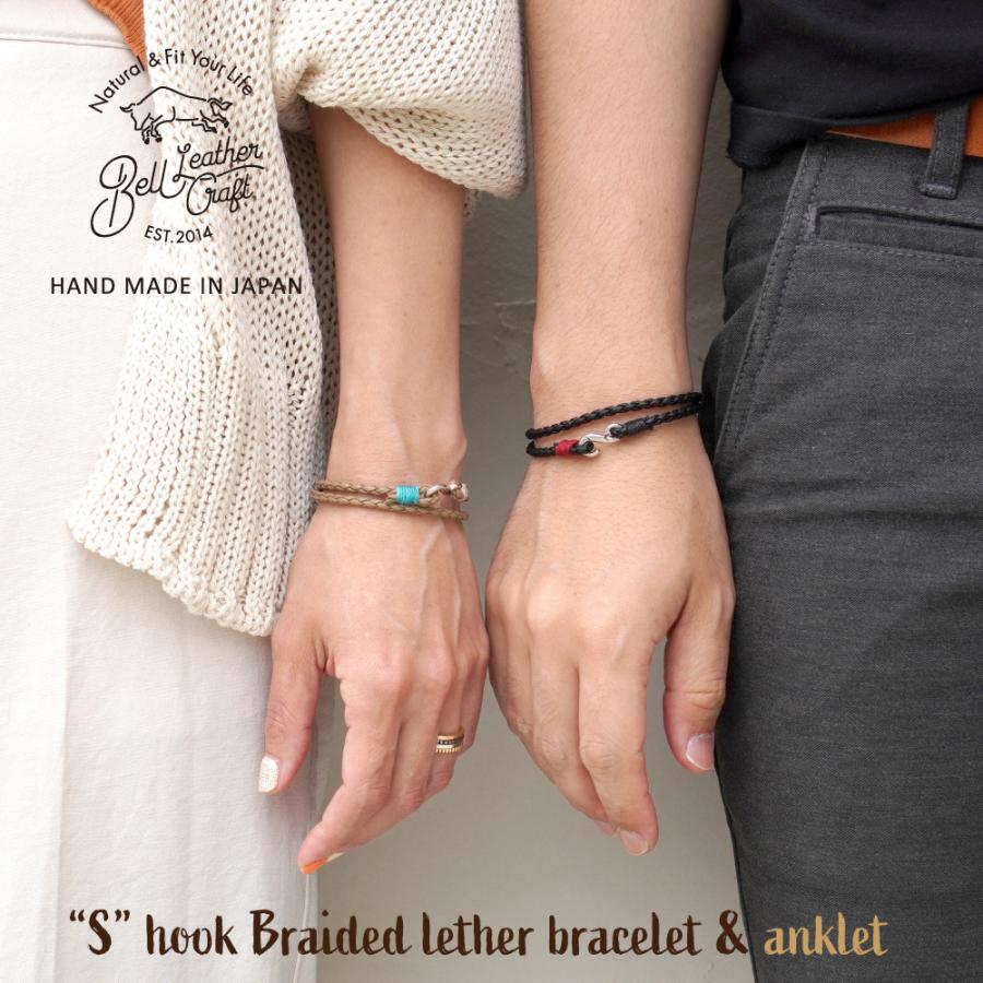 シンプルなS字形状のフックに上質な姫路レザーの編み込み(ブレイデット)革紐を組み合わせた当店オリジナルのブレスレット&アンクレットのご紹介です。