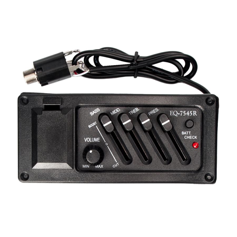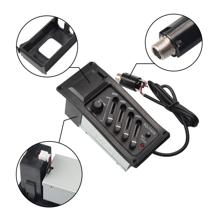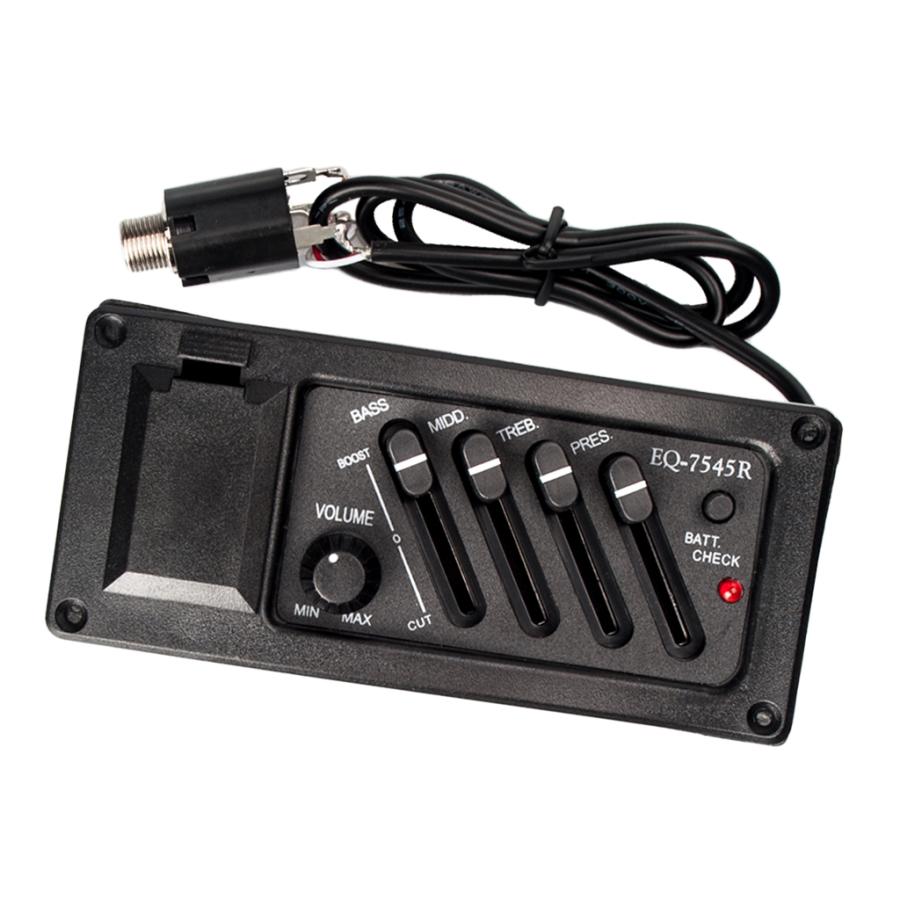 標準的なアコースティックギターやシガーボックスギターに最適な4バンドEQ-7545Rピックアップイコライザーシステム.湾曲したプラスチック表面は.標準的なアコースティックギターの湾曲した側面に適合します. 4バンド(ベース/ミドル/トレブル/プレゼンス)とボリュームコントロール.9ボルトバッテリー用の内蔵バッテリーホルダー(含まれていません).ローバッテリーインジケーター.ロッドピエゾセラミックピックアップは.優れた音色とピックアップ範囲を提供し.標準的なアコースティックギターのサドルの下に取り付けられるように作られていますが.シガーボックスギターブリッジにも簡単に組み込むことができます.組み立てが簡単なように配線済みで.6.35mm(1/4インチ)の出力ジャック付きの接続ワイヤ.