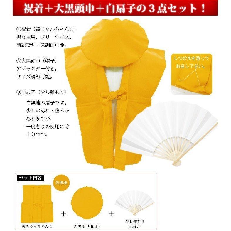 《無地 黄色ちゃんちゃんこ+大黒頭巾+白扇子セット》 ■商品説明 商品には、以下3点が含まれます。 ・黄色ちゃんちゃんこ(無地) ・大黒頭巾 ・少し難あり白扇子(少しの汚れ・傷み等があります) フリーサイズ 素材:ポリエステル100% 中国製 注意点 商品にはしつけ糸がついております。 モニターによって色が若干異なる事があります。 納品書・領収書は同封いたしておりません。