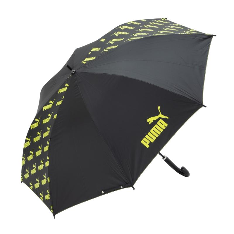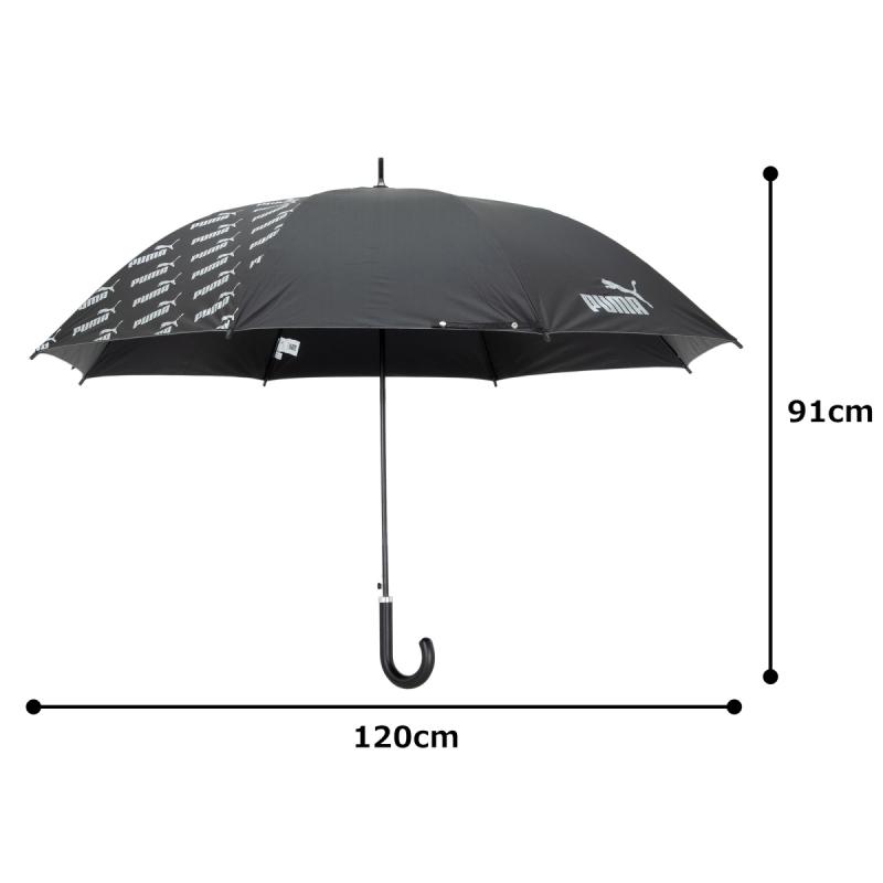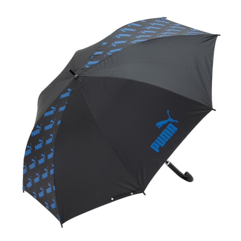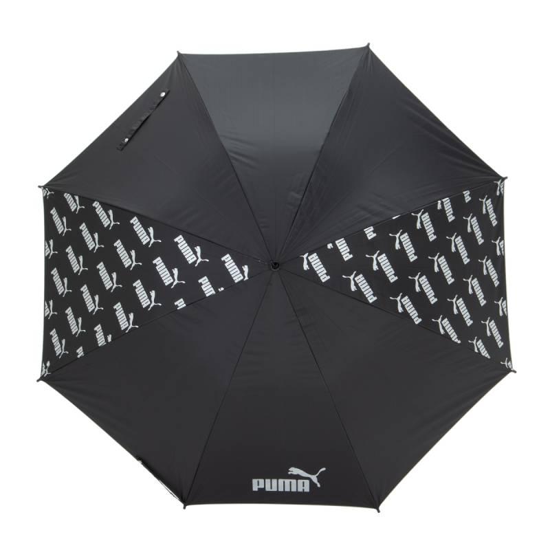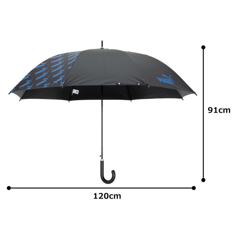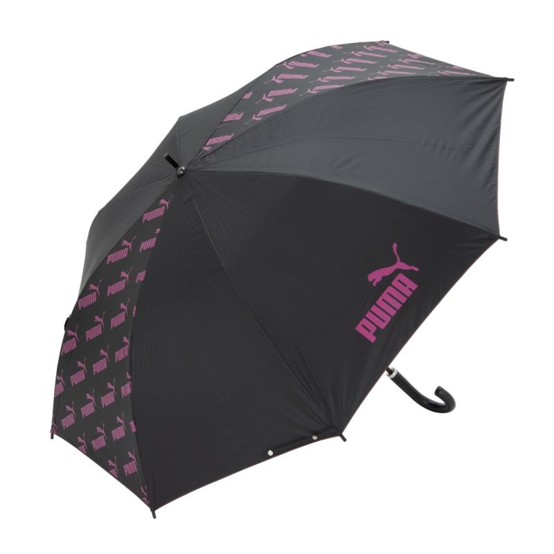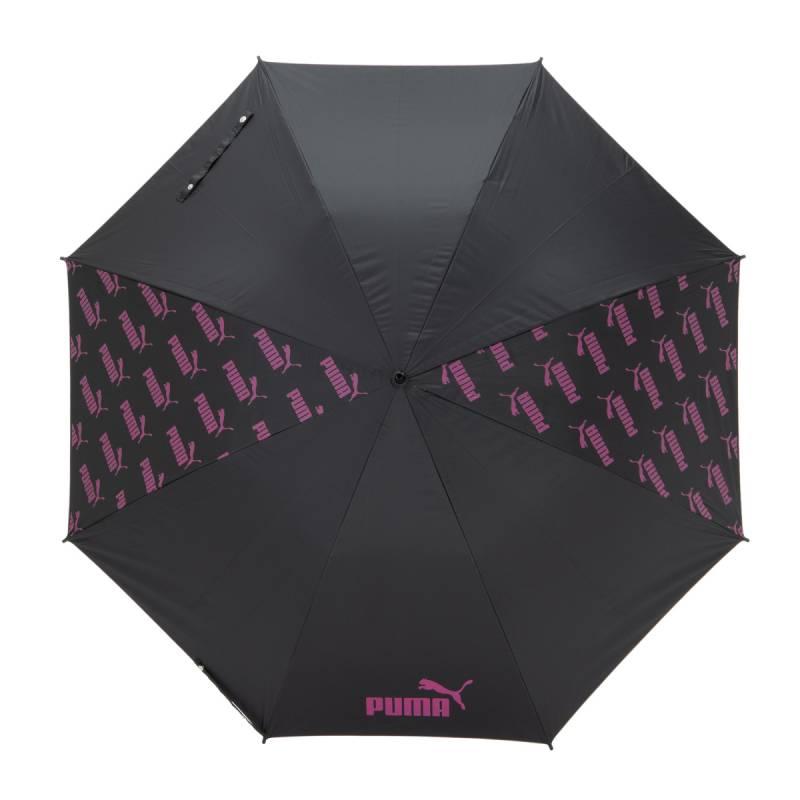 プーマのブラックコーティング生地の大判晴雨兼用傘。ブラックコーティング生地使用で、UVカット率・遮光率99%以上です。スポーツ観戦用、ゴルフ傘としてもご使用になれます。2駒にプーマのブランドロゴの総柄がプリントしてあります。