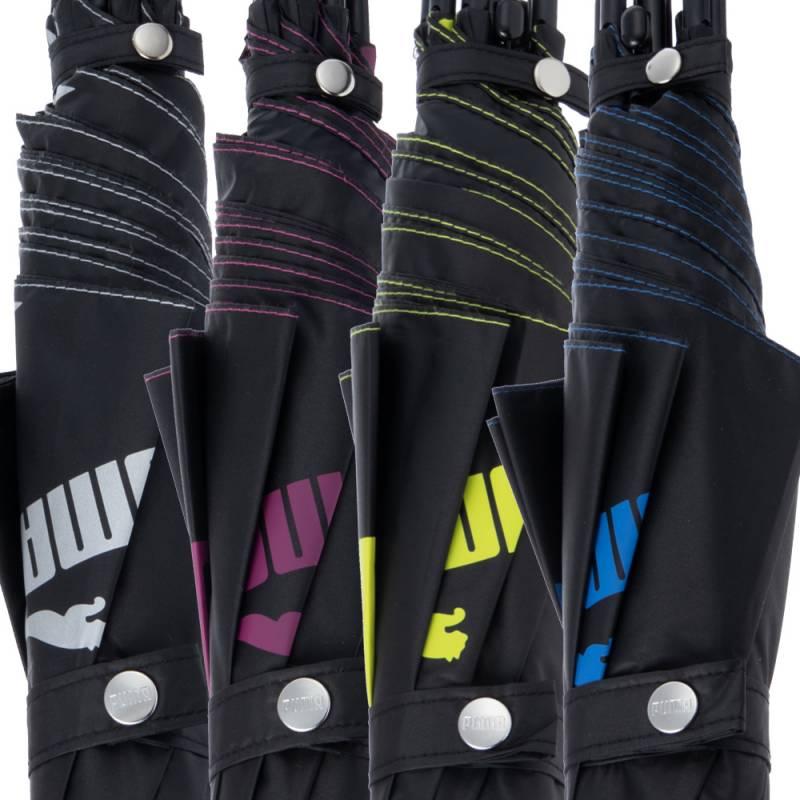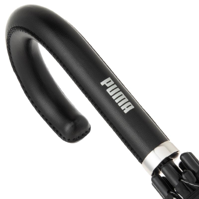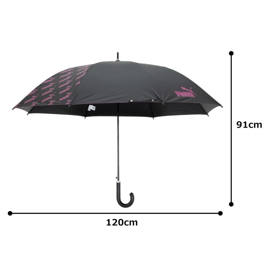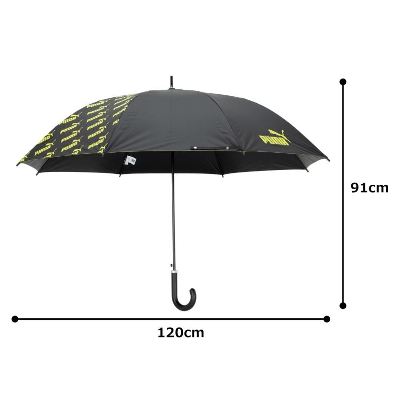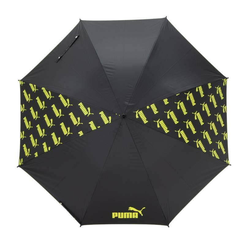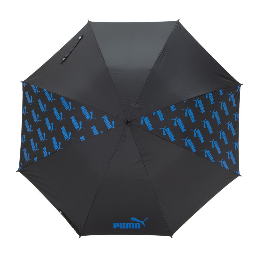 プーマのブラックコーティング生地の大判晴雨兼用傘。ブラックコーティング生地使用で、UVカット率・遮光率99%以上です。スポーツ観戦用、ゴルフ傘としてもご使用になれます。2駒にプーマのブランドロゴの総柄がプリントしてあります。