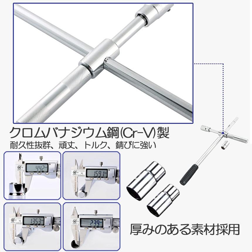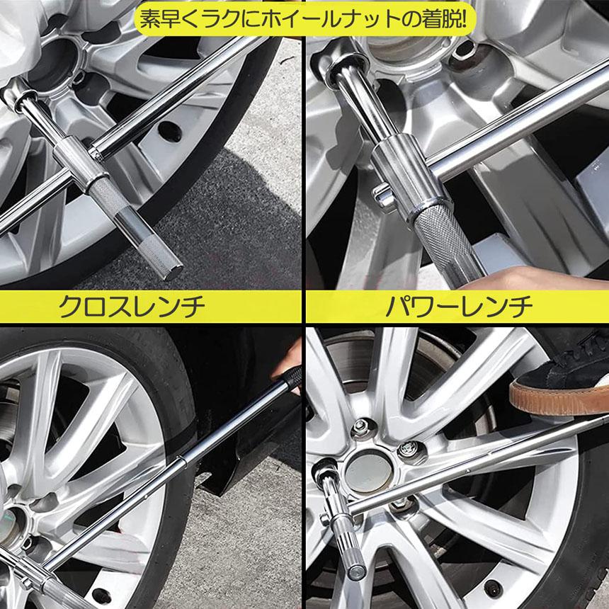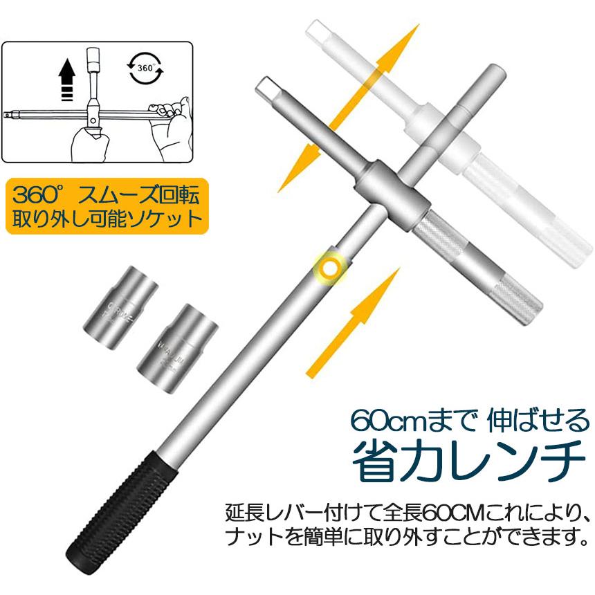 【伸縮式レンチ】:伸縮式で移動するラグレンチは、最大のてこ比で60cmまで伸びます。 これにより、ナットを簡単に取り外すことができます。