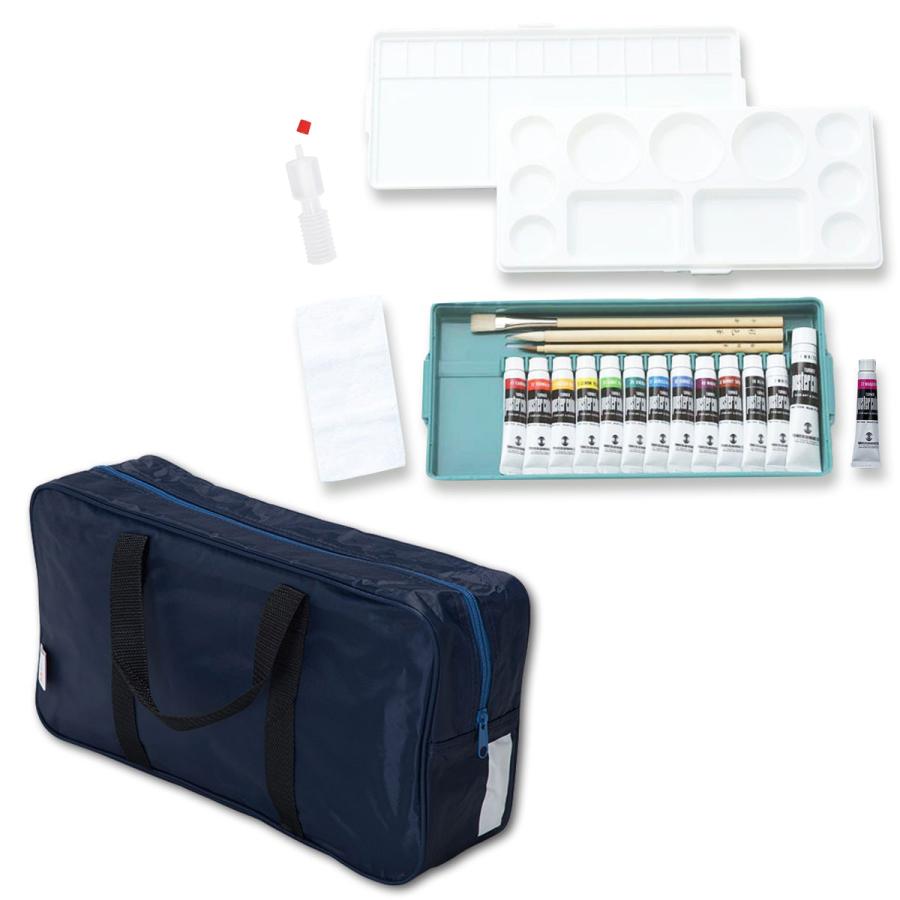 美術のかばん、ターナーポスターカラー・プライムセット13A(スポンジ無し)、当店オリジナル生徒用デザイン筆(然毛)本組(色・面相・平)、ミニ布巾、スポイト