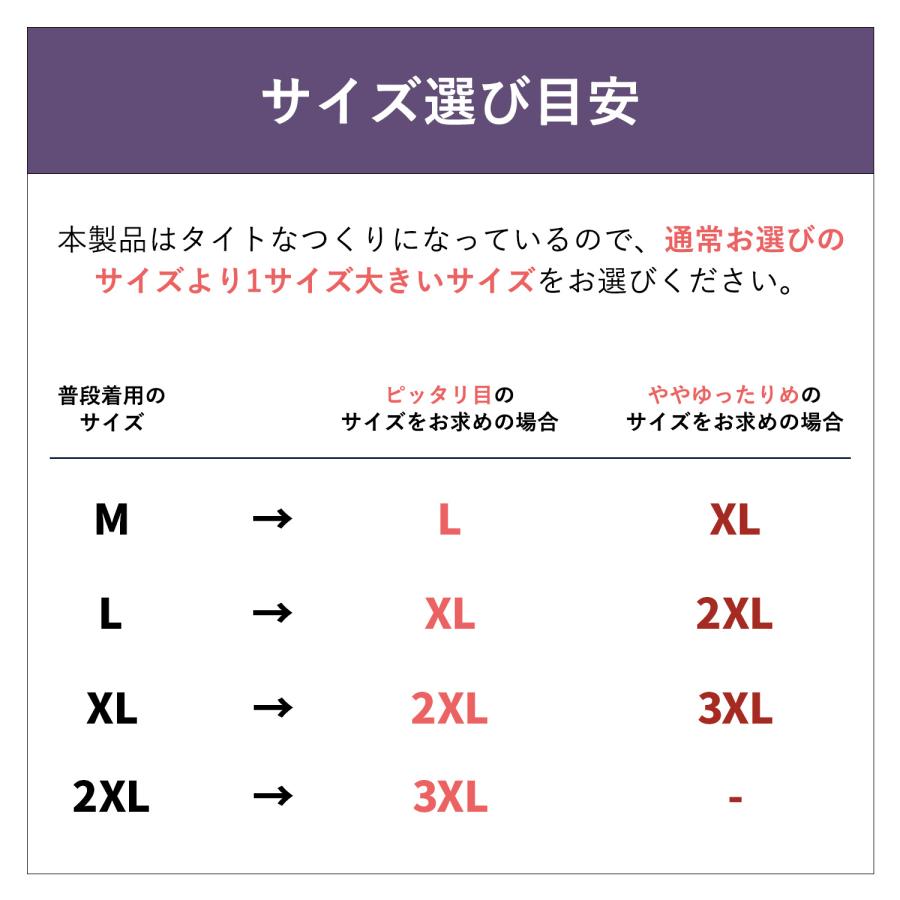 タイトなつくりになっているので、通常お選びのサイズより1サイズ大きいサイズをお選びください。(ややゆったりめに着たい方は2サイズ)