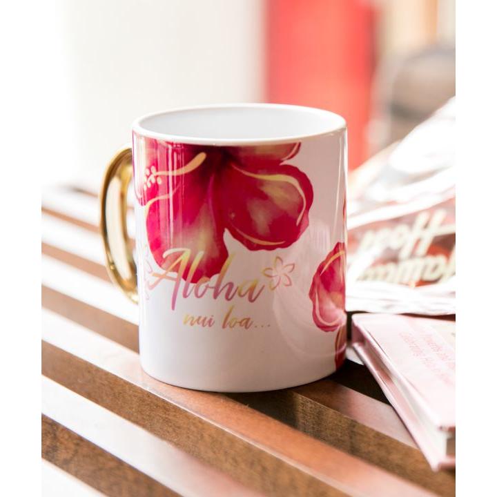 金・銀の持ち手と水彩タッチのハイビスカスで上品さが光るマグカップ。
