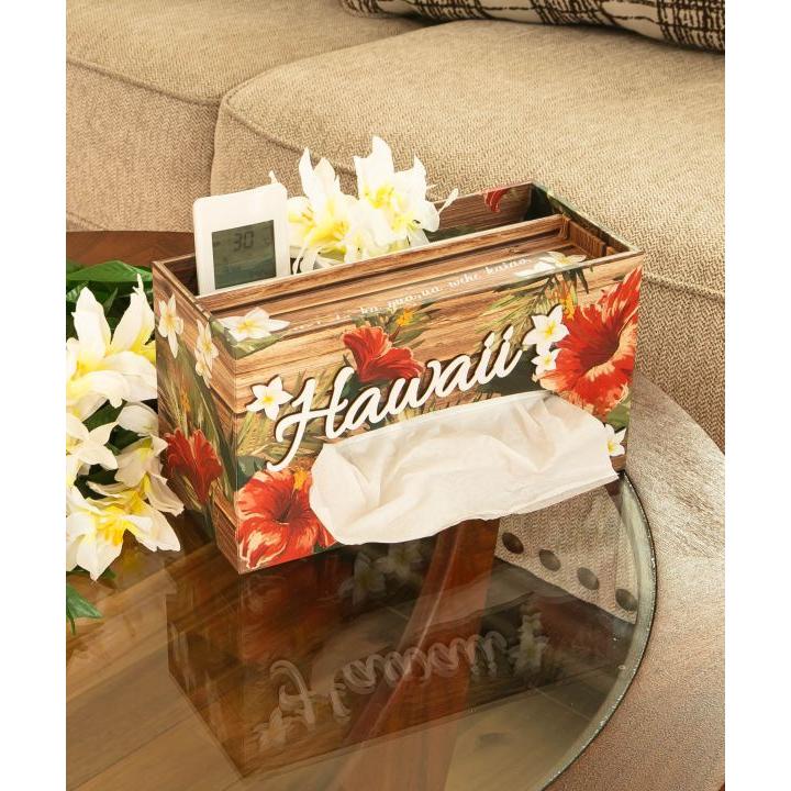 ハイビスカス、ホヌが描かれた箱型のティッシュケース。