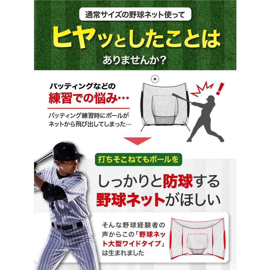 【広範囲を防球する大型ワイド野球ネット】練習をしていてヒヤッとしたことはありませんか?こちらのネットは380cmと幅が広く、上部にネットを設置したので万が一打ち損ねても安心♪広範囲をしっかりと防球してくれる大型ワイドタイプの野球ネットです。