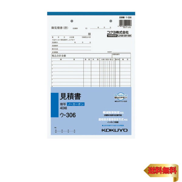 ・【行数】 18行 【組数】 40組書くと圧力で発色するノーカーボンタイプの見積書 ●商品特徴 ・小口が発色していないノーカーボン複写です。保管・保存に優れています。 ・圧力で発色し、手が汚れにくいノーカーボン紙タイプ。書いてすぐにきれいでクリアな発色を実現します。 ・全面どこに記入しても複写可能です。 (2019年10月より消費税軽減税率制度が施行されます。) ●コクヨの伝票・領収証は今までの使い心地はそのままに、新制度に対応した伝票へとリニューアルを行います。 (商品は順次切り替わる予定です) ●新制度になっても現行品でそのまま対応できます。 ・2税混在する伝票への記載事項は、必ずしも1枚の書類で満たしている必要はなく、相互の関係が明確な複数の書類全体で記載事項を満たしていればよいため、税率別に伝票を2枚に分ければ 、今までの伝票でもお使いいただけます。 領収証も同様に、税率別に2枚に分ければ現行品はそのまま使えます。 2023年10月以降のインボイス制度でも、空いているスペースに登録番号を記載いただくことで、現行品を使用することができます。 ●軽減税率制度の対象品目を扱わない場合や1枚の伝票に2税が混在しない場合リニューアルされた新罫も、1税分のみ記入することで、そのままお使いいただけます。