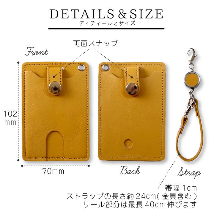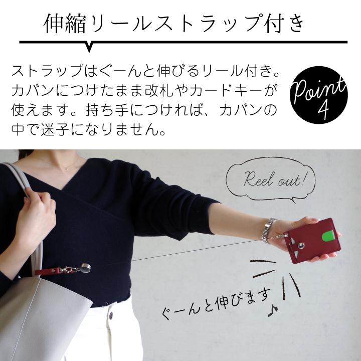 ・ボタン付きでカードのうっかり落下による紛失防止・お子様のカードホルダーとして・おしゃれな本革パスケース(播州レザー)・メンズ レディス どちらにも使用できるデザインとカラー・クリスマスや新入学・新社会人などのギフトもオススメ・毎日の通勤通学の定期入れに・リール付きで伸ばして改札にかんたんタッチ