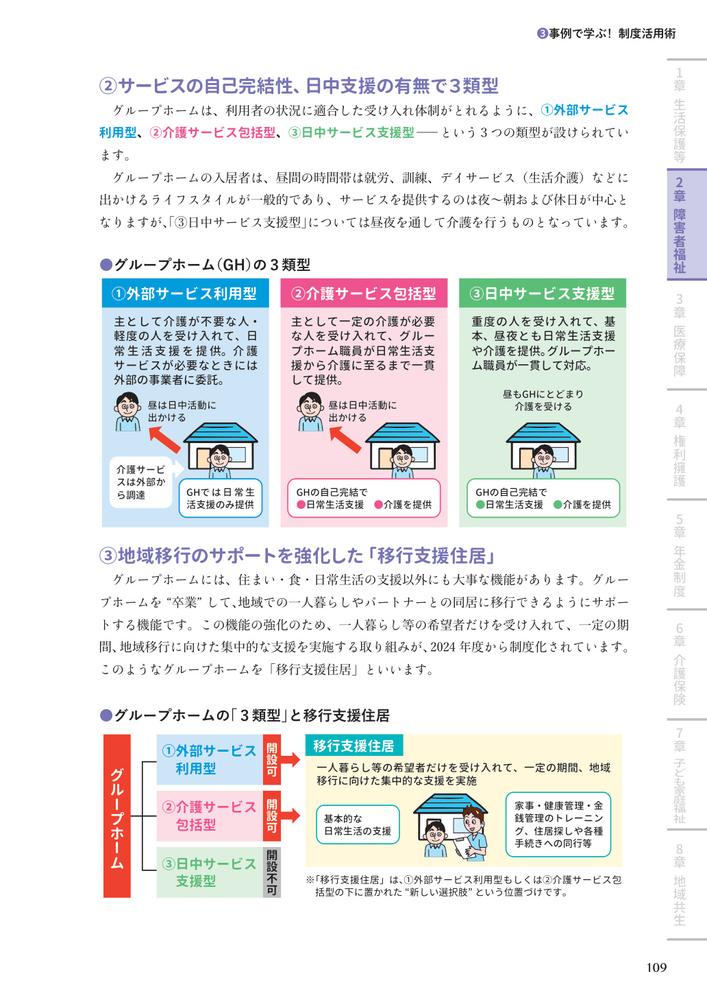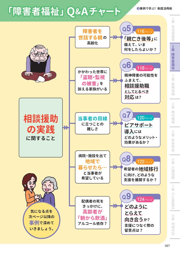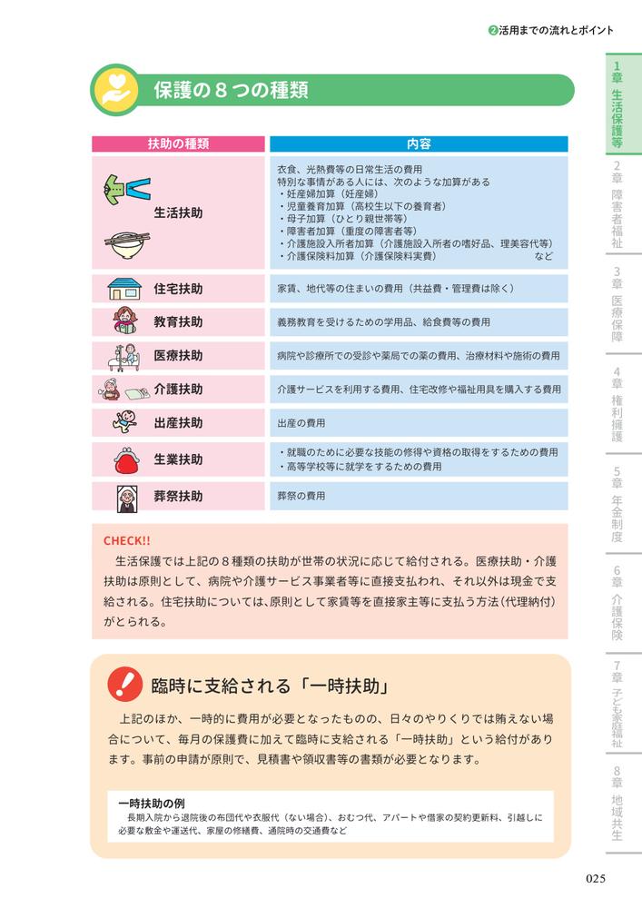 第1章 生活保護等/第2章 障害者福祉/第3章 医療保障/第4章 権利擁護/第5章 年金制度/第6章 介護保険/第7章 子ども家庭福祉/第8章 地域共生