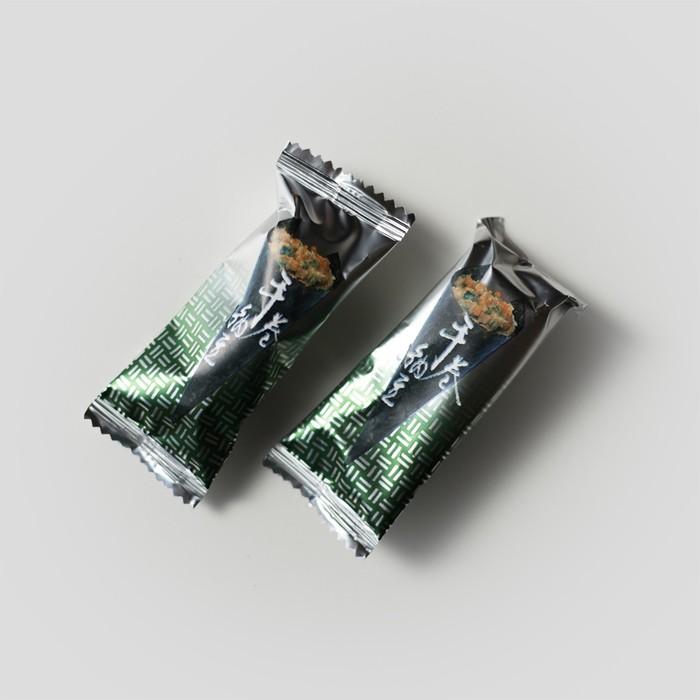 一枚一枚手作業で巻き上げた円錐型の海苔の器に乾燥納豆等の練物を混ぜ合わせた、サクサクと歯ごたえのある手巻き寿司状の一口サイズのお菓子の一品です。
