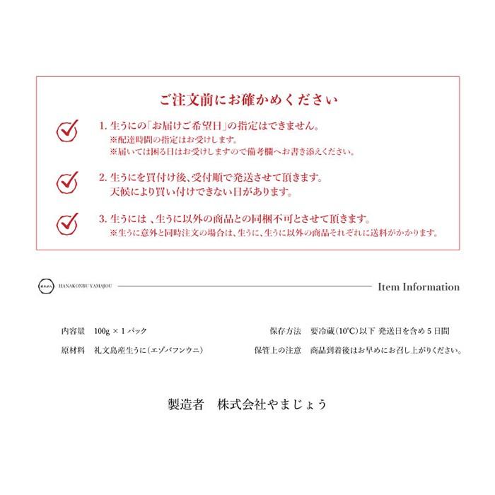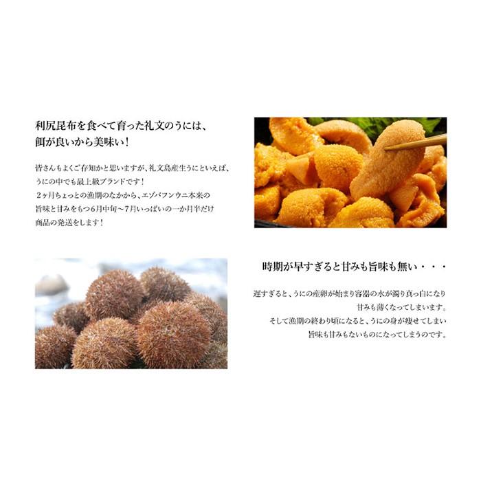 【特価表示について…】 ※当店では毎回の入札毎に価格を改定しております。 [変動価格]となっております事をご承知下さい。 お安く仕入れできたときはお安く販売♪ 先ず当店の生うには、品質保持剤や防腐剤、型崩れを防止するための『ミョウバン』は一切使用しておりません! 新鮮な生うに本来の味を召し上がっていただきたくこのような方法でお送りしております。 日本海にある礼文島の海は時化が多く、また資源保護の観点から水揚げ量も制限されており毎日うに漁が行われるわけではございません! そこで以下、商品説明にございます事柄についてご了承、ご承知いただきますようお願い申し上げます。