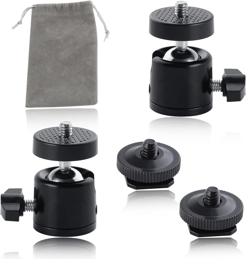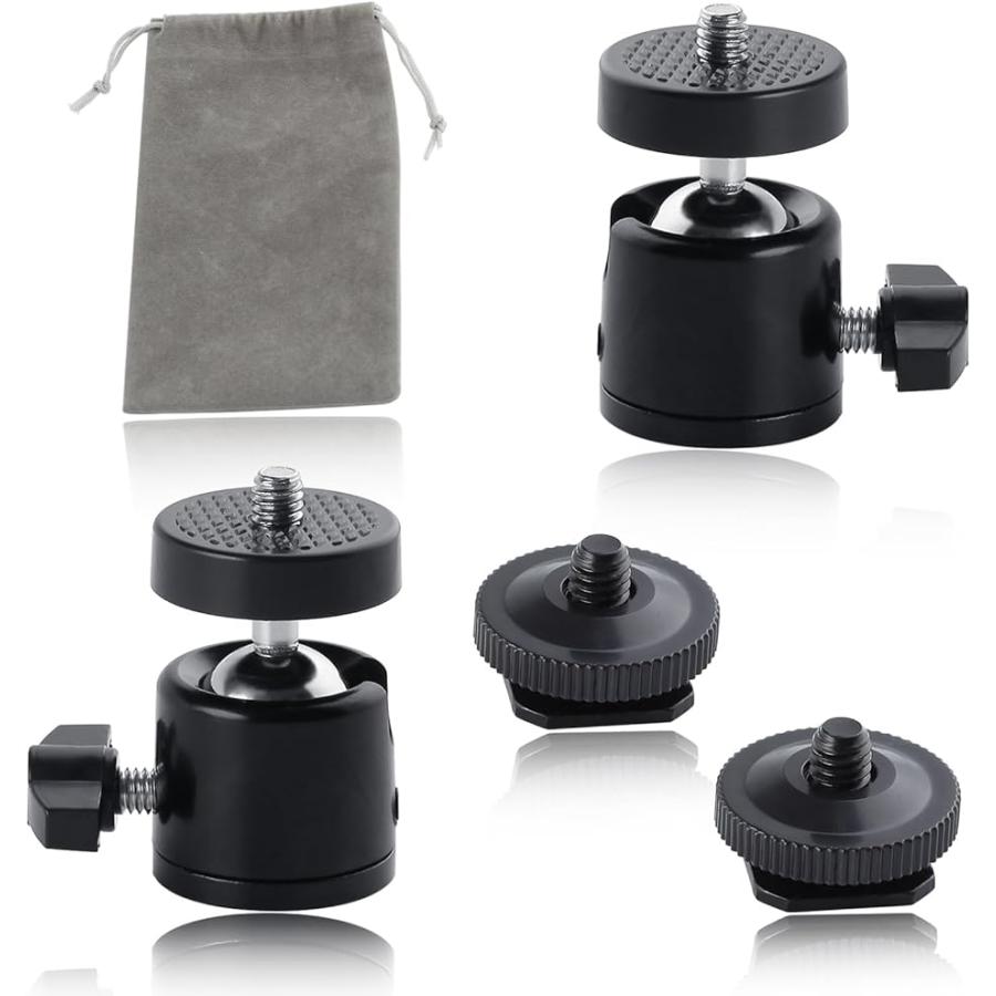 「セット内容」2本 x 自由雲台、2本 x 1/4 ネジ ホットシューアダプター、1本 x グレー収納バッグ。
