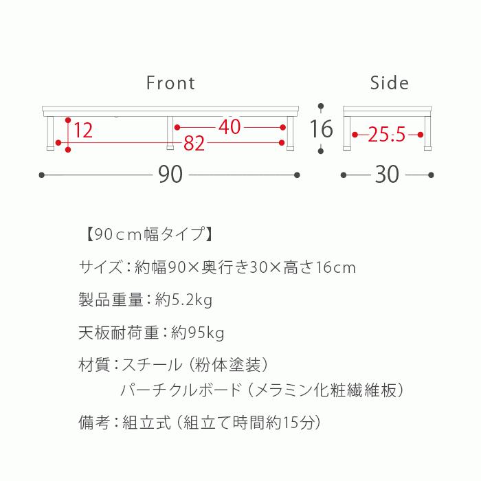 ご予約商品の入荷日が確定後、メールにてご連絡いたします。その際に、お届け希望日の指定も承ります。※現在受付中の時期以前の予約分は完売しました。■お届け目安(ご予約販売除く)※1営業日後出荷【90cm幅タイプ】【サイズ】約幅90×奥行き30×高さ16cm【製品重量】約5.2kg【天板耐荷重】約95kg【材質】スチール(粉体塗装)、パーチクルボード(メラミン化粧繊維板)【備考】組立式(組立て時間約15分)