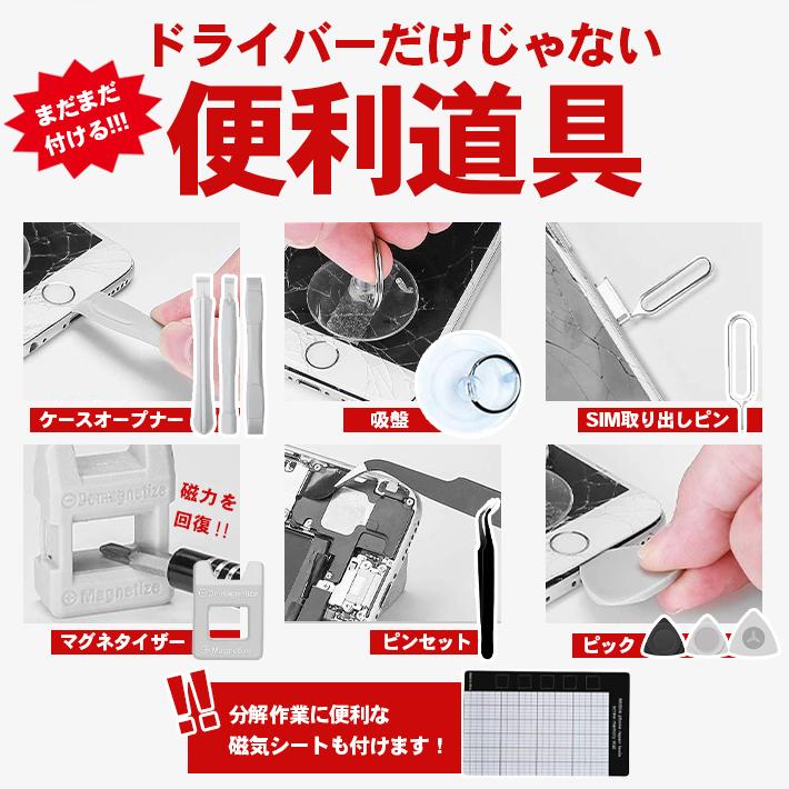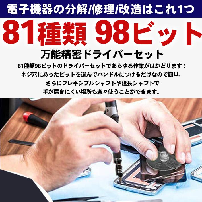 【商品概要】電子機器の分解、修理、改造などあらゆる作業に対応する精密ドライバーセットです。・81種98ビット・ハンドル・延長シャフト・フレキシブルシャフト・ビットホルダー・ケースオープナー・吸盤・SIM取り出しピン・マグネタイザー・ピンセット・ビック・磁気シート