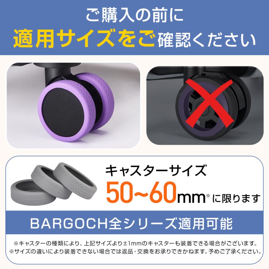 BARGOCH 多用途キャスターカバー【製品仕様】・カラーパープル、レッド、ブラック、グレー、ピンク、グリーン、イエロー・サイズ50-65mmキャスター対応【パッケージ内容】・キャスターカバー*2/10個・取扱説明書*1製品説明■ぴったりサイズでキャスター保護、寿命延長■キャスターの損傷を防止■騒音低減■簡単装着