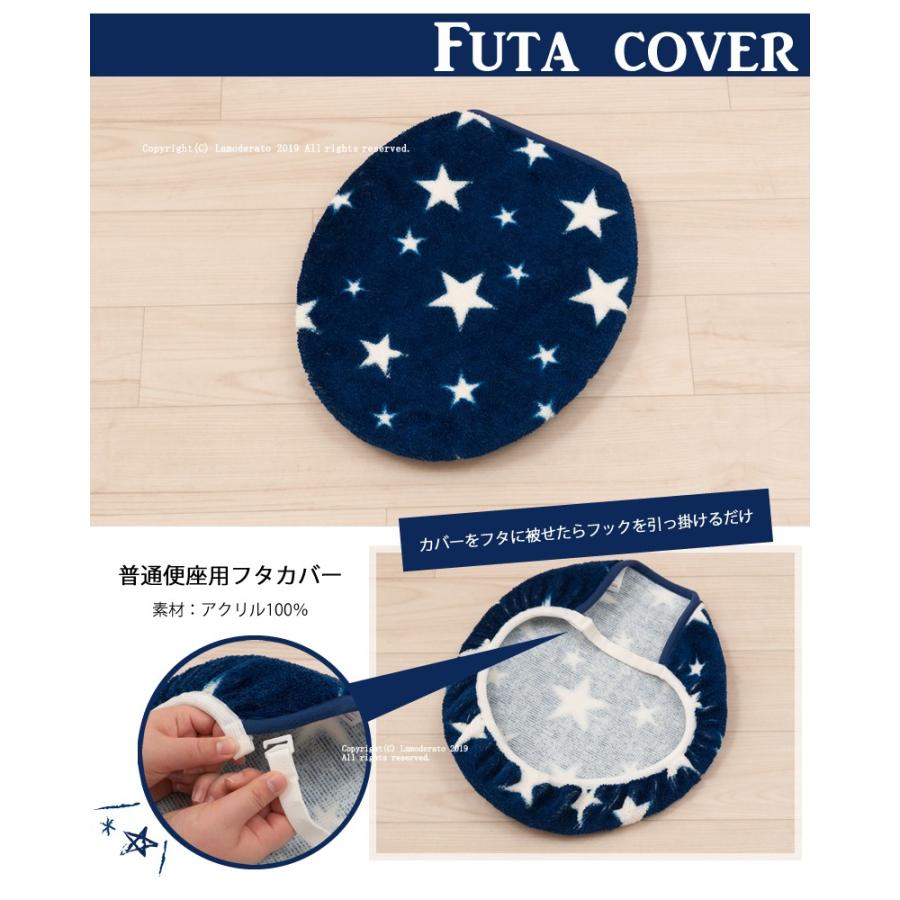 フタのタイプ:普通便座用素材:アクリル100%カラー:アイボリー・ネイビーブルー日本製※ご注文前に、フタカバー対応表をご確認ください。ポップでカジュアルな星柄の、普通便座用フタカバーです。