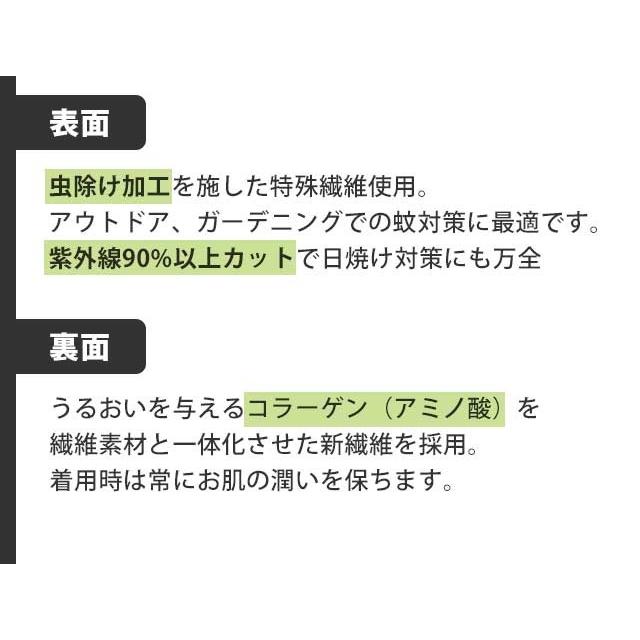 表面には、虫よけ加工をした特殊繊維で、外出時やガーデニングなど、アウトドアでの不快な虫対策に最適です。