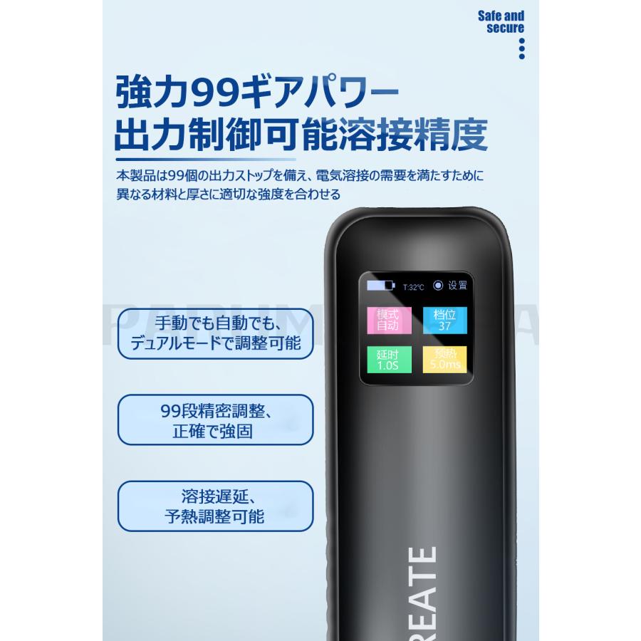 強力99ギアパワー:本製品は99個の出力ストップを備え、電気溶接の需要を満たすために、異なる材料と厚さに適切な強度を合わせる,手動でも自動でも、デュアルモードで調整可能、99段精密調整、正確で強固、溶接遅延、予熱調整可能。