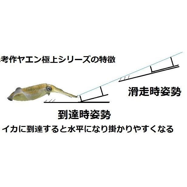 ヤエンがイカに到達すると針先が持ち上がり掛かりやすくなります。。