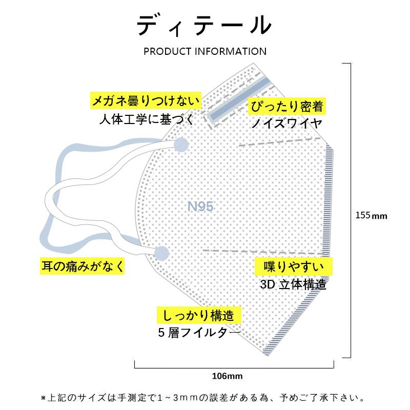 n95マスク ホウイト 個包装 50枚入 n95 マスク 高機能 5層構造 3Dマスク 男女兼用 大人マスク コロナ フリーサイズ ウィルス 防護マスク 飛沫感染防止 インフルエンザ 防塵立体 マスク 使い捨て 予防 通気性 PM2.5微粒子 不織布マスク メルトブロー 熱風コットン