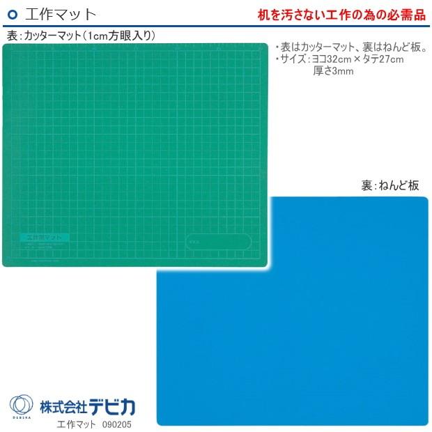小学校の図工の授業に机を汚さない工作の為の必需品<BR>・表はカッターマット、裏はねんど板。<BR>工作マット(品番090205)<BR>サイズ:約)横320×縦270×厚さmm 重さ:約)380g<BR>カットしやすい1cm方眼入り /材質-再生PVC<BR>メーカー 株式会社 デビカ Debika