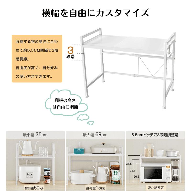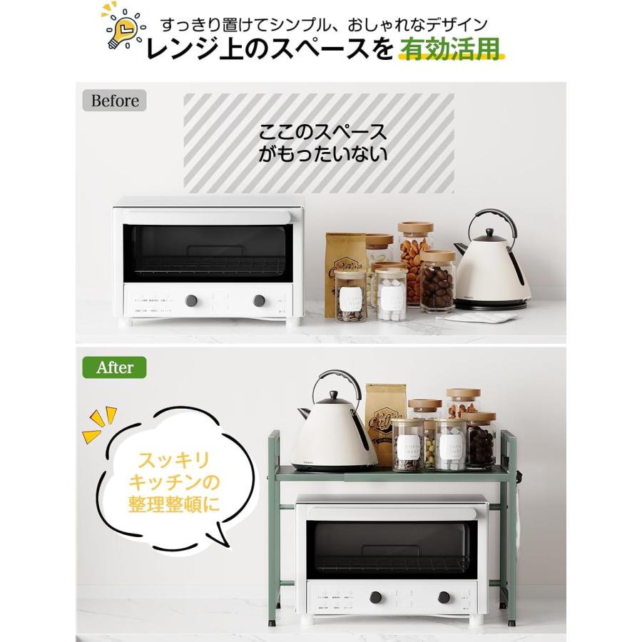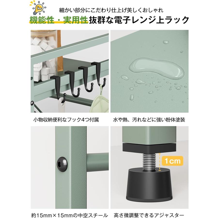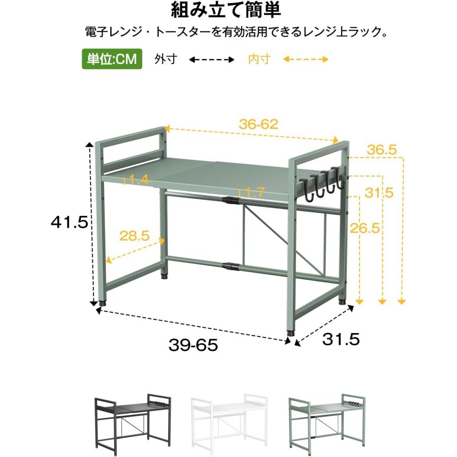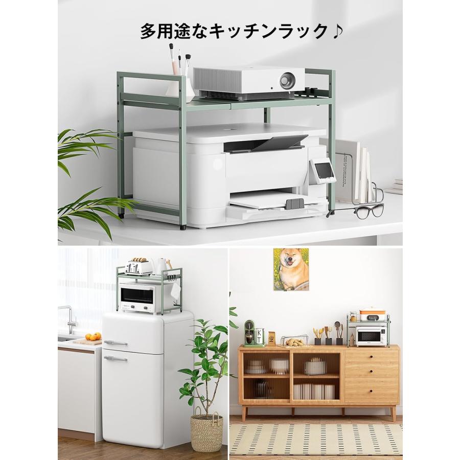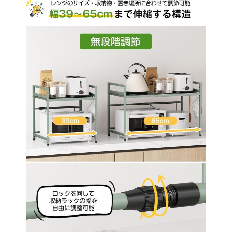 【幅伸縮自在&高さ3段調節】収納ラックの幅の伸縮範囲は39cm〜65 cm(内寸)の間で無段階に調節でき、可動棚板は約5cm間隔で3段階で高さ調節可能。電子レンジやオーブン等の小家電に適用し、調味用品、キッチン用品を簡単に綺麗に収納できます。上層の両側は手すり設計を採用し、置物倒れ防止する上、小物を掛けるのに便利なフックが4個付属。四つの足の高さも微調整可能で、デスクトップのバランスが崩れている場合は、高さを調整できます。
