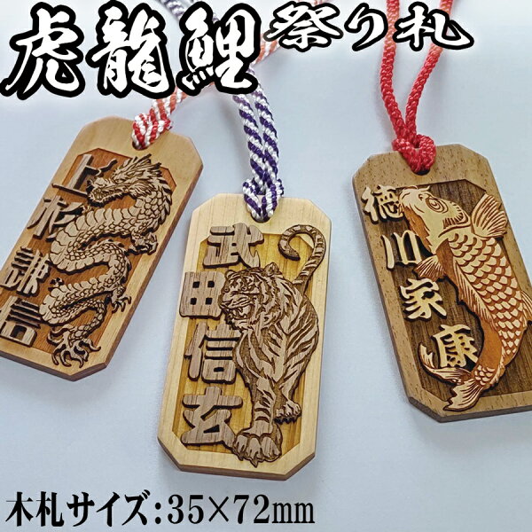 千社札風木札です。虎と龍と鯉のモチーフを刻印し複数の木材を貼り合わせ、文字とモチーフ部分に別種の木を組み合わせることにより文字とモチーフ部分をより際立たせた木札です。