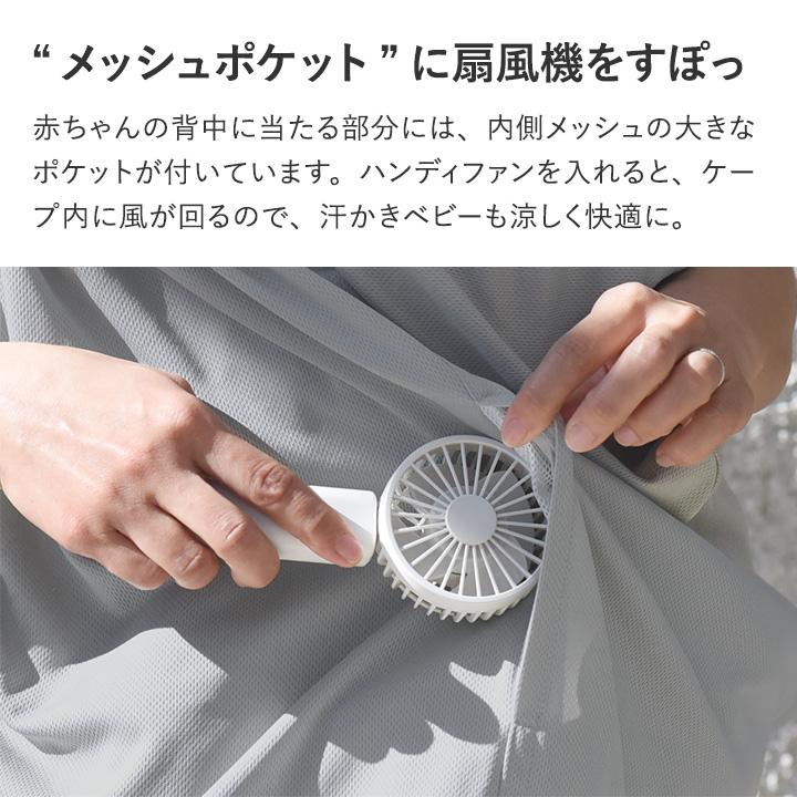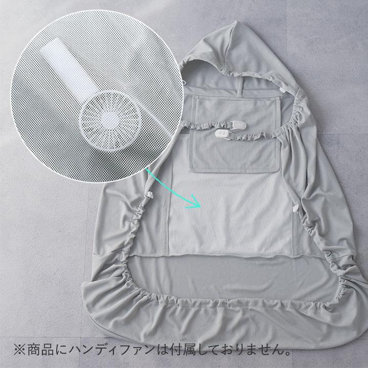 ファンポケットが付いたUVケープ。真夏の紫外線からベビーを守ってくれる高機能素材のケープです。ファンで風を流すことができて、保冷剤を入れることでヒンヤリ感もアップ。