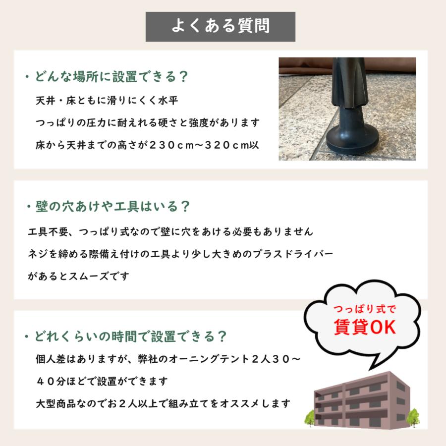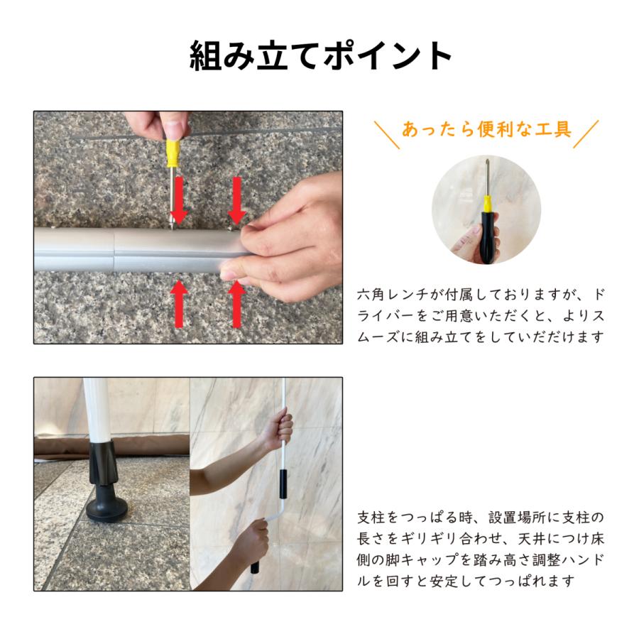 【設置も取り外しもお手軽なつっぱり式】つっぱり式なので、場所を選ばず簡単に取付けが可能で業者を手配する必要はありません。 組立説明書付きで、女性の方でも簡単に組み立てられます。※2人での作業が好ましいです