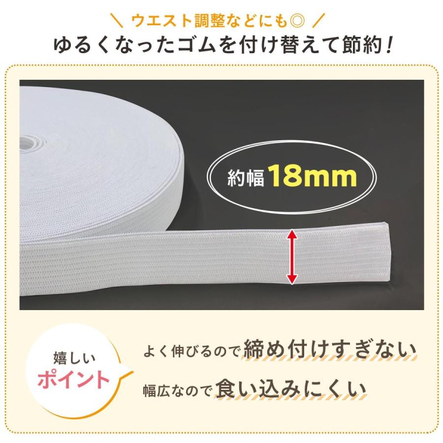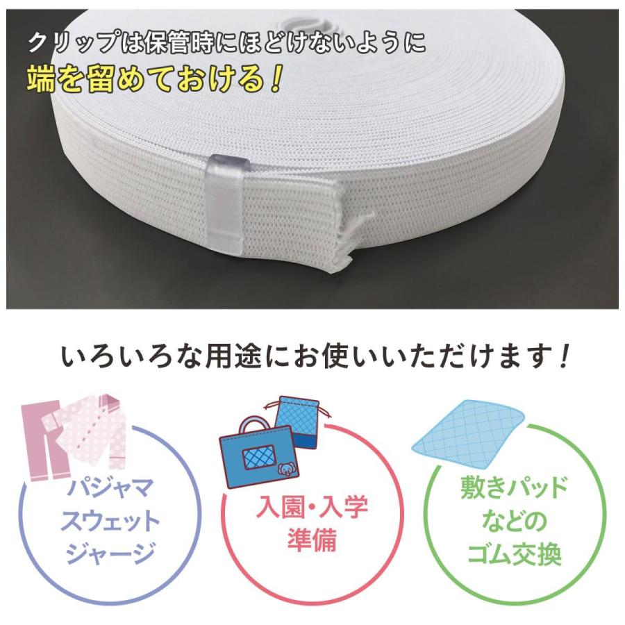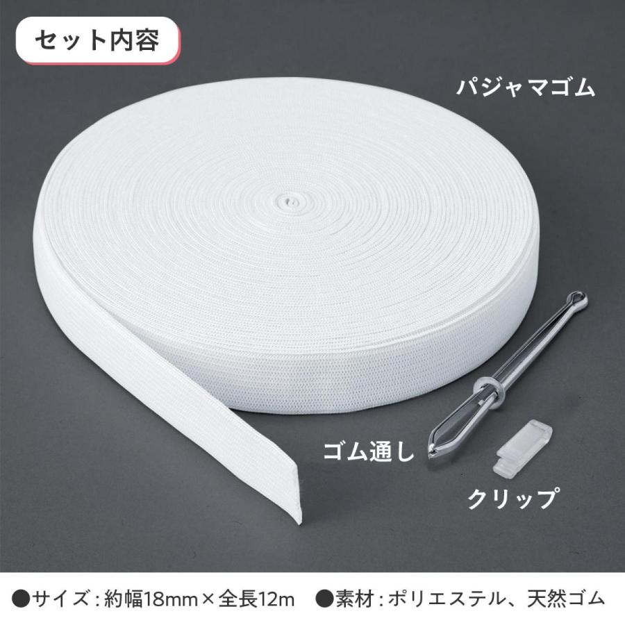 \幅広で食い込みにくい/・ゴムが伸びてしまったパジャマやスウェットなど、ゴムを付け替えて節約!・よく伸びて締め付けすぎず、幅広なので食い込みにくい!・付属のゴム通しは先端が凸凹形状になので、ゴムをしっかり挟んで途中で抜けにくい!・入園・入学の準備や敷きパッドなどのゴム交換にも◎・12mなのでたっぷり使える♪【サイズ】約幅18mm×全長12m【素材・材質】ポリエステル、天然ゴム【付属品】ゴム通し、クリップパジャマゴム/衣替え/敷きパッド/入園/入学/パジャマ