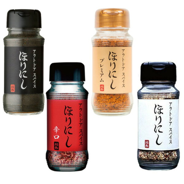 ●セット内容:アウトドア スパイス ホリニシ 100g/アウトドア スパイス ホリニシ 辛口90g/アウトドア スパイス ホリニシ プレミアム100g/燻製アウトドア スパイス ホリニシ ブラック100g。