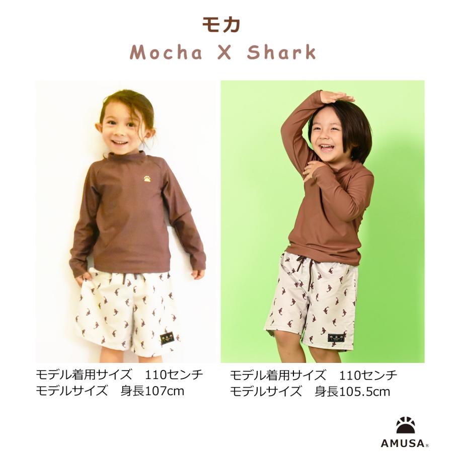 かっこいい雰囲気のシャーク柄・ロブスター柄パンツと長袖ラッシュガードの2点セット。茶系とブラック系、グレイ系に新たにブルー系が加わり、大人っぽいテイストの4色。ロブスター柄は、ホワイト、ミント、レッドの3色。全7色展開。ロブスター柄ホワイトとシャーク柄・モカとシャーク柄ホワイト・ブルーはパパとのリンクコーデがお楽しみいただけます。UVカットの生地を使っているので、日差しの気になる屋外プールや海でも安心です。パンツは2枚仕立ての安心設計。元気に遊んでほしいので、動きやすさ着心地に拘りました。ベビー80センチからジュニア150センチまで、8サイズをご用意。セパレートなので、お着替えもラクチン。ベビーからジュニアまでお楽しみ頂ける洗練された拘りのデザインです。こちらのページは110cmサイズ〜130cmサイズの販売ページになります