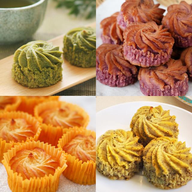 お百姓さんが作ったスイートポテト・プレーンと、お百姓さんが作ったスイートポテトシリーズから(むらさき芋・栗・他季節限定商品)の中から3〜4種類お入れいたします。