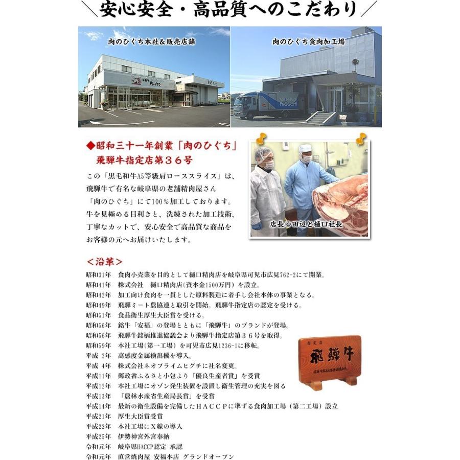 ◆安心・安全・高品質へのこだわり この「霜降り黒毛和牛A5等級肩ローススライス」は、飛騨牛で有名な岐阜県の老舗精肉屋「肉のひぐち」にて100%加工しております。牛を見極める目利きと、洗練された加工技術、丁寧なカットで安心安全で高品質な商品をお客様の元へお届けいたします。