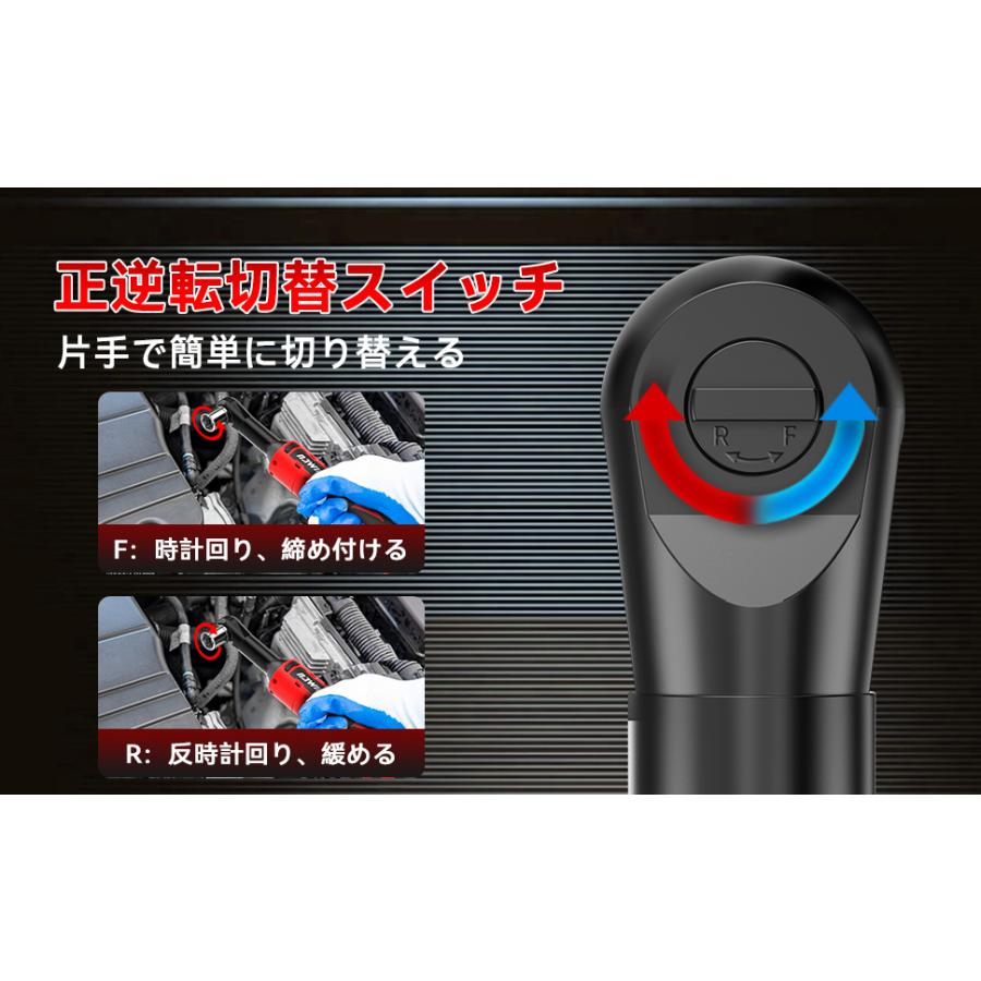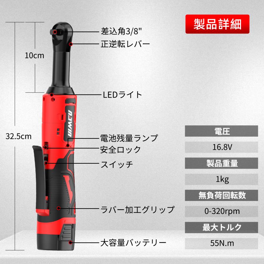 電動ラチェット、2000mah大容量リチウム電池×2、ソケットは7本(サイズ違い)、長ソケット*2本(14/17mm)とブラス/マイナスビットもあり、通常のネジの締付作業もできます。あと6.5mm変換ビットと手動ラチェットレンチも付属しています。様々なシーンに活躍できます。