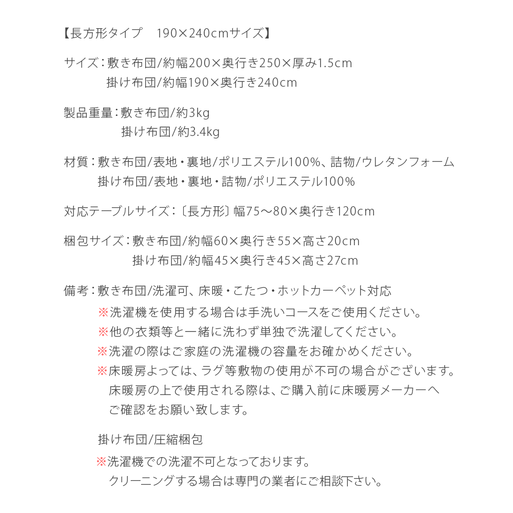 ■お届け目安(ご予約販売除く)※1営業日後出荷【長方形タイプ 190×240cmサイズ】【サイズ】敷き布団/約幅200×奥行き250×厚み1.5cm掛け布団/約幅190×奥行き240cm【製品重量】敷き布団/約3kg掛け布団/約3.4kg【材質】表地・裏地/ポリエステル100%、詰物/ウレタンフォーム【対応テーブルサイズ】〔長方形〕幅75〜80×奥行き120cm【梱包サイズ】敷き布団/約幅60×奥行き55×高さ20cm掛け布団/約幅45×奥行き45×高さ27cm