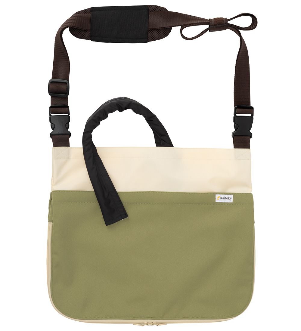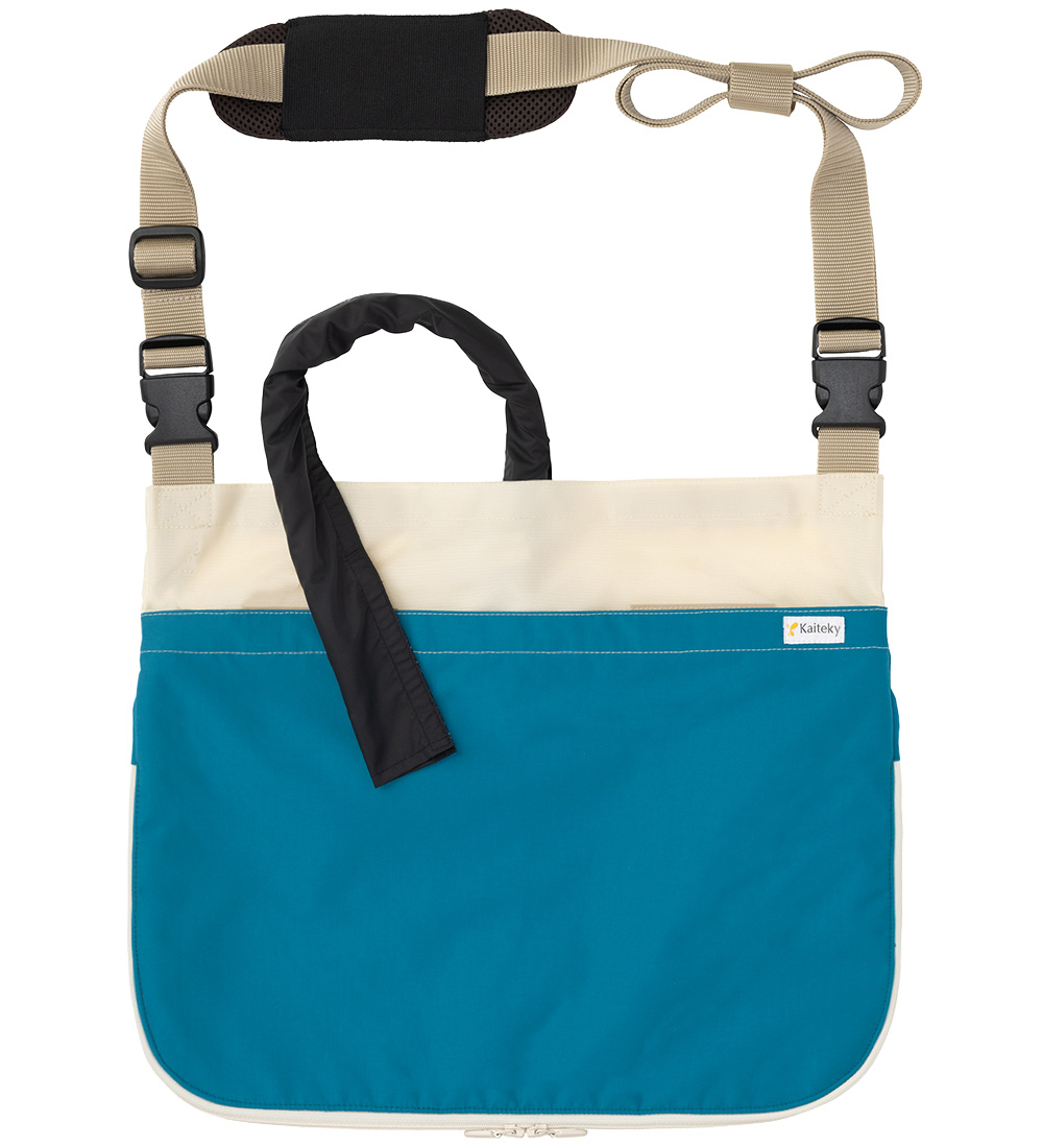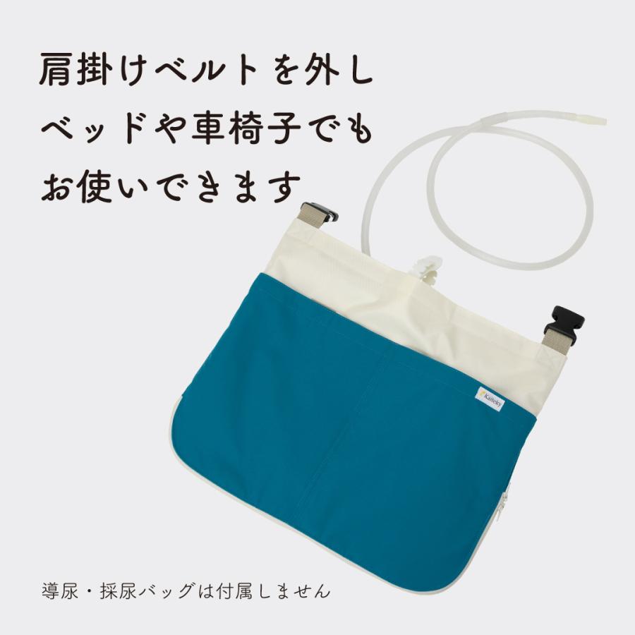 導尿バックサイズ 350mm × 280mmまで対応可能です。洗濯もできて常に清潔に使用いただけます。ベルト通しや縦型導尿バッグの揺れ防止バンド、肩パッドなど改良を加えました。また、ホースカバー約50cmが標準装備となりました。分かりやすい利用マニュアル付き。