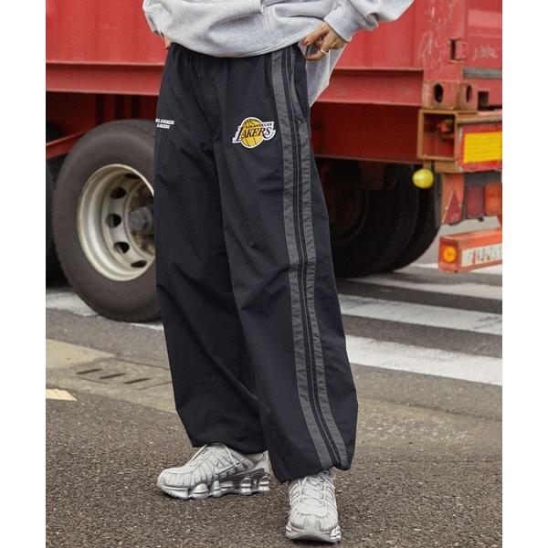 商品名:NBA/エヌビーエー 別注 チームロゴ刺繍 サイドライン ドロスト撥水ナイロンワイドトラックパンツ