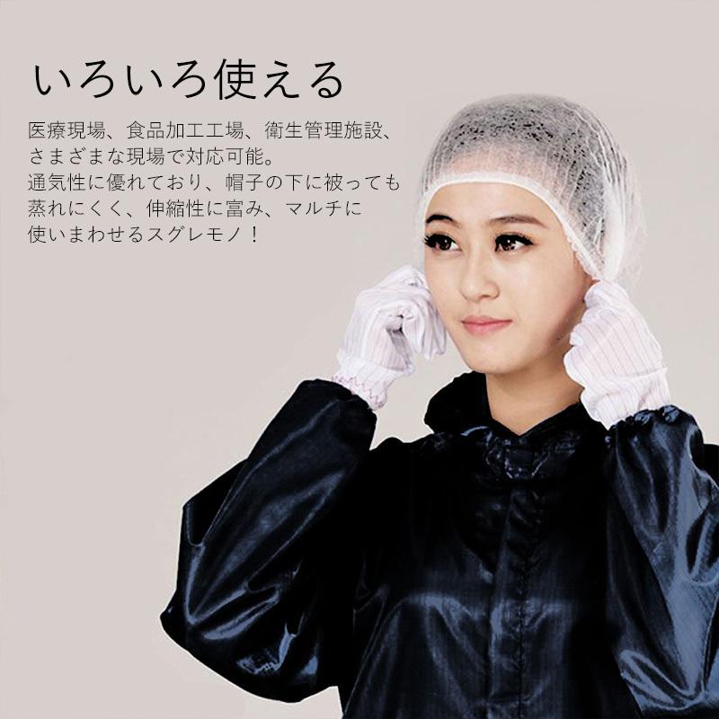医療現場、食品加工工場、衛生管理施設、さまざまな現場で対応可能。 通気性に優れており、帽子の下に被っても蒸れにくく、伸縮性に富み、マルチに使いまわせるスグレモノ! 使用前はジャバラ状に折り畳まれており、使うと元に戻らないので、衛生確認ができ、安心してお使いいただけます。 左右の手で持ち両側に開くように展開するとキャップ状になります。 男女兼用フリーサイズ。 内周約30cm〜86cmまで伸縮し、子供、女性、男性、誰でも着用可能。内周:約30cm〜86cm内容量:10個