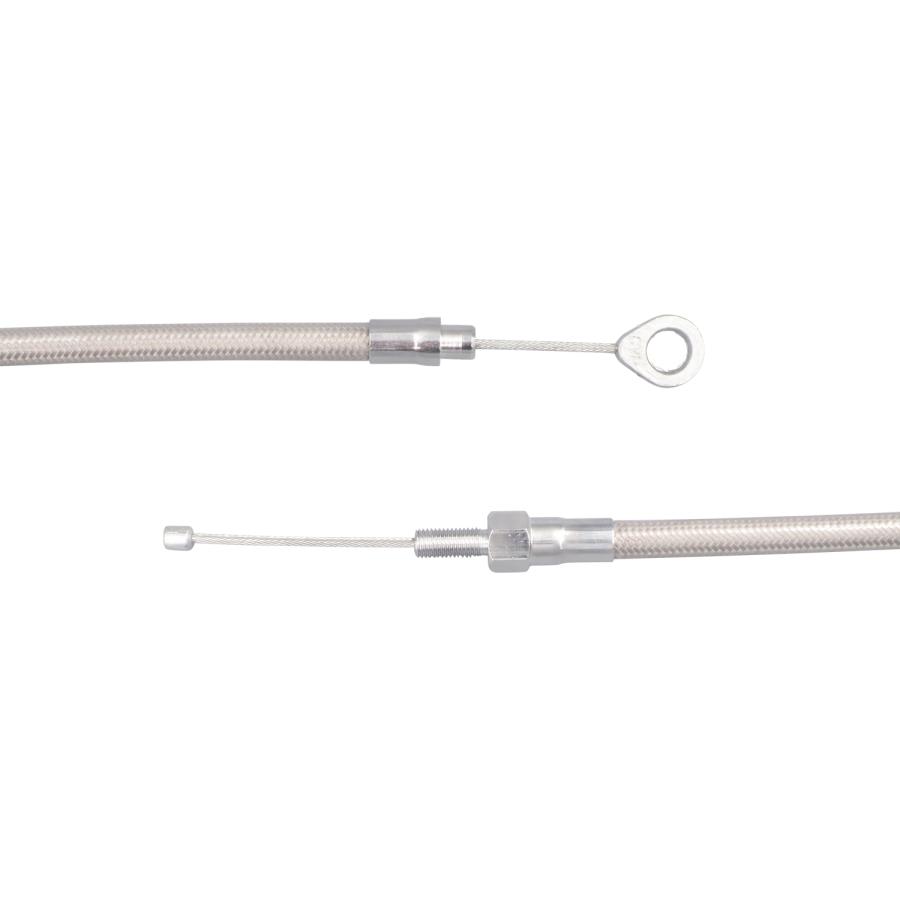 ・メーカー:NEO FACTORY(ネオファクトリー)・メーカー品番:019851・OEM:38607-87(参考情報)・適合車種:87年式以降の5速BT用・色:アウター部:素地 金属部:クローム・素材:アウター部:ステンレスメッシュ 金属部:スチール・サイズ:62インチ(約1575mm)トラベルレングス約70mmミッションカバー固定部〜アジャスターナットまでの長さ:約820mm・内容物:クラッチケーブル×1本ピボットピン×1個Oリング×1個