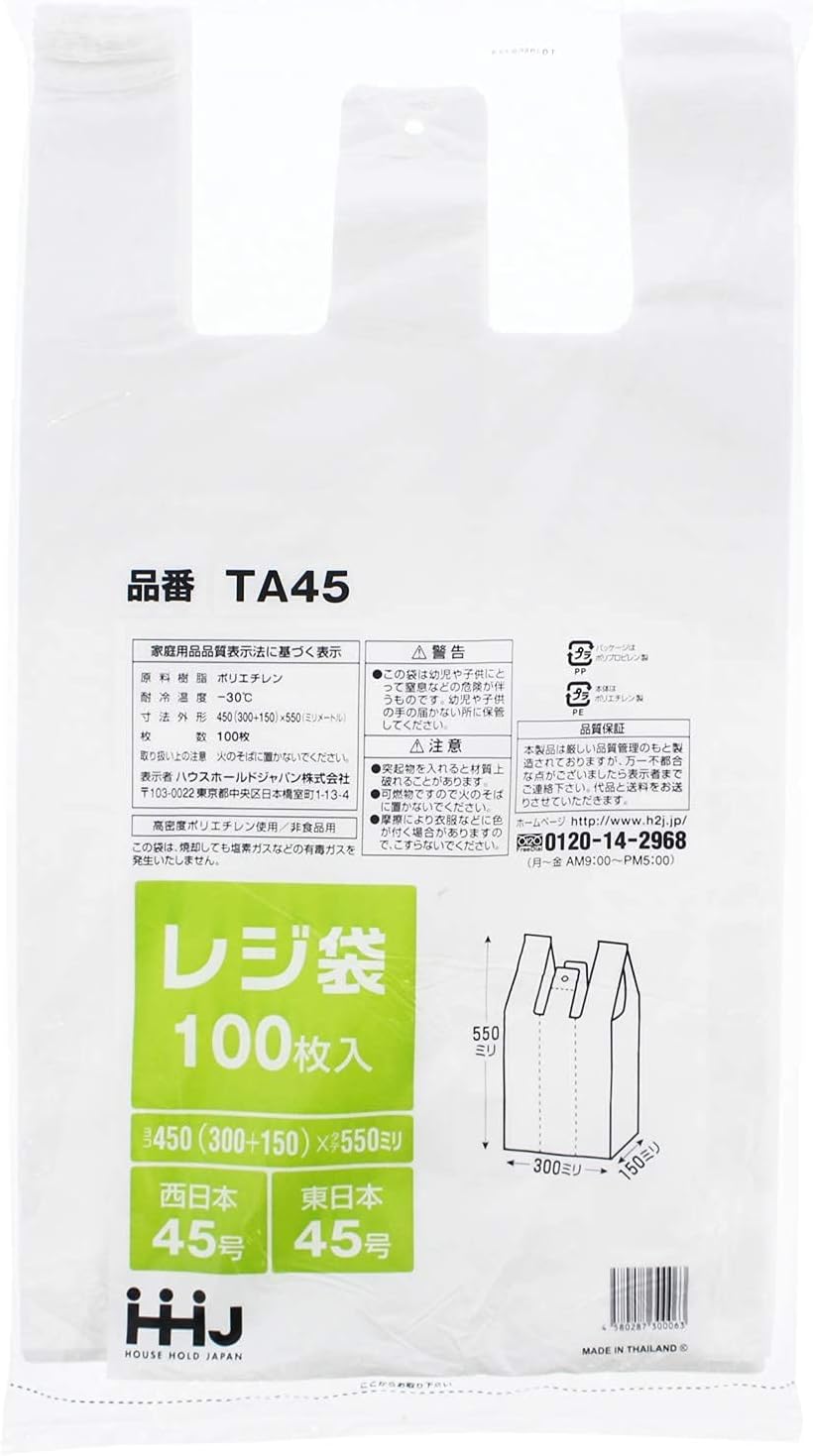 ハウスホールドジャパン レジ袋 東西日本 45号 乳白色 厚さ0.018mm TA-45 100枚 ( エコバッグ ゴミ袋 ごみ袋 大きめ 大きい 大 大きいサイズ 吊り下げ 袋 持ち運び )