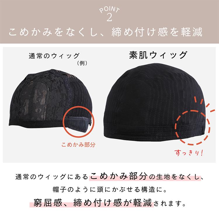 素肌ウィッグとは、ゆったりしたサイズ感と、伸縮性を追求し、長時間着用していてもストレスのない